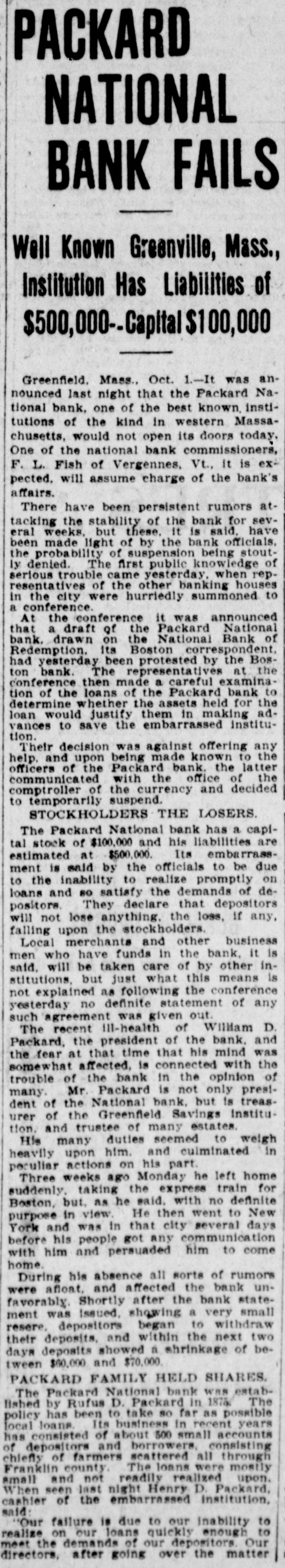 PACKARD NATIONAL BANK FAILS Well Known Greenville, Mass., Institution Has Liabilities of $500,000--Capital$100,000 Greenfield. Mass., Oct. 1.-It was announced last night that the Packard National bank, one of the best known, institutions of the kind in western Massachusetts, would not open its doors today. One of the national bank commissioners, F. L. Fish of Vergennes, Vt., it is expected. will assume charge of the bank's affairs. There have been persistent rumors attacking the stability of the bank for several weeks, but these. it is said. have been made light of by the bank officials, the probability of suspension being stoutly denied. The first public knowledge of serious trouble came yesterday, when representatives of the other banking houses in the city were hurriedly summoned to a conference. At the conference it was announced that a draft of the Packard National bank. drawn on the National Bank of Redemption. its Boston correspondent, had yesterday been protested by the Boston bank. The representatives at the conference then made a careful examination of the loans of the Packard bank to determine whether the assets held for the loan would justify them in making advances to save the embarrassed institution. Their decision was against offering any help. and upon being made known to the officers of the Packard bank. the latter communicated with the office of the comptroller of the currency and decided to temporarily suspend. STOCKHOLDERS THE LOSERS. The Packard National bank has a capital stock of $100,000 and his liabilities are estimated at $500,000. Its embarrassment is said by the officials to be due to the inability to realize promptly on loans and so satisfy the demands of depositors. They declare that depositors will not lose anything. the loss, if any, falling upon the stockholders. Local merchants and other business men who have funds in the bank, it is said. will be taken care of by other institutions, but just what this means is not explained as following the conference yesterday no definite statement of any such agreement was given out. The recent ill-health of William D. Packard, the president of the bank, and the fear at that time that his mind was somewhat affected, is connected with the trouble of the bank in the opinion of many Mr. Packard is not only president of the National bank, but is treasurer of the Greenfield Savings Institution. and trustee of many estates. His many duties seemed to weigh heavily upon him. and culminated in peculiar actions on his part. Three weeks ago Monday he left home suddenly. taking the express train for Boston, but. as he said. with no definite purpose in view. He then went to New York and was in that city several days before his people got any communication with him and persuaded him to come home. During his absence all sorts of rumors were afloat, and affected the bank unfavorably Shortly after the bank statement was Issued, showing a very small resere, depositors began to withdraw their deposits. and within the next two days deposits showed a shrinkage of between $60,000 and $70,000. PACKARD FAMILY HELD SHARES. The Packard National bank was established by Rufus D. Packard in 1875. The policy has been to take so far as possible local loans Its business in recent years has consisted of about 500 small accounts of depositors and borrowers, consisting chiefly of farmers scattered all through Franklin county. The loans were mostly small and not readily realized upon. When seen last night Henry D. Packard, cashier of the embarrassed institution, said 'Our failure is due to our inability to realize on our loans quickly enough to meet the demands of our depositors Our