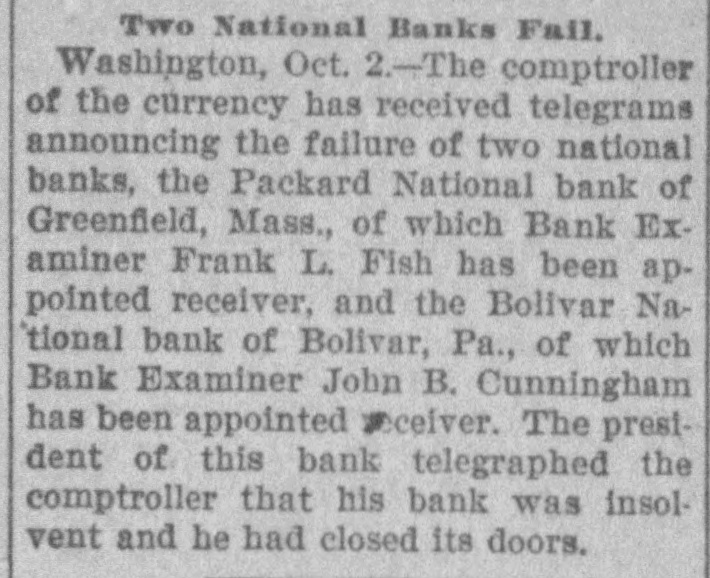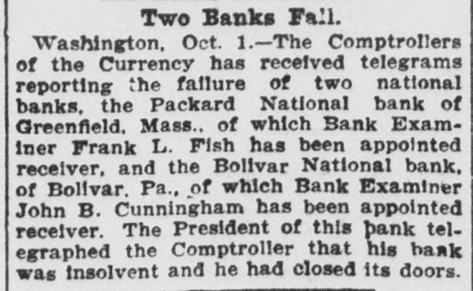 TWO BANK FAILURES. One at Greenfield, Mass., and One at Bolivar, Pa. Washington, Oct. 1.-The comptroller of the currency has received telegrams announcing the failure of two national banks, the Packard National bank of Greenfield, Mass., of which Bank Examiner Frank L. Fish has been appointed receiver, and the Bolivar National bank of Bolivar, Pa., of which Bank Examiner John B. Cunningham has been appointed receiver. The president of this bank telegraphed the comptroller that his bank was insolvent and he had closed its doors.