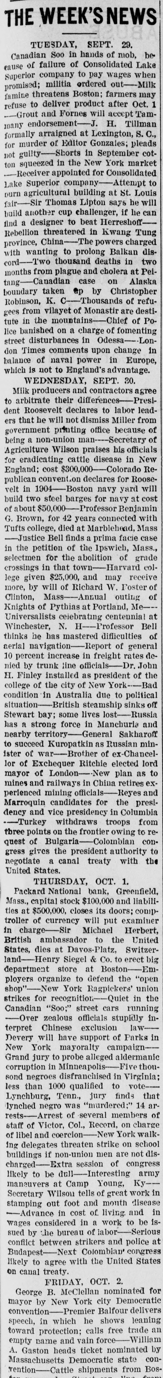 E WEEK'S NEWS TUESDAY, SEPT. 29. nadian Soo in hands of mob, beof failure of Consolidated Lake rior company to pay wages when - crder millitia :pes! de threatens Boston; farmers may e to deliver product after Oct. 1 rout and Fornes will accept Tamendorsement-J. H. Tillman ally arraigned at Lexington, S.C., nurder of Editor Gonzales; pleads uilty-Shorts in September cotqueezed in the New York market eceiver appointed for Consolidated Superior company-Attempt to agricultural building at St. Louis -Sir Thomas Lipton says he will another cup challenger, if he can a designer to beat HerreshoffIlion threatened in Kwang Tung nce, China-The powers charged wanting to prolong Balkan dis--Two thousand deaths in two hs from plague and cholera at Pei-Canadian case on Alaska lary taken up by Christopher uson, K. C-Thousands of refufrom vilayet of Monastir are destiin the mountains-Chief of Popanished on a charge of fomenting up 7 Times comments upon change in ce of naval power in Europe, h is not to England's advantage. WEDNESDAY, SEPT. 30. lk producers and contractors agree bitrate their differences-PresiRoosevelt declares to labor leadhat he will not dismiss Miller from rnment printing office because of JO ------------------------- notun-tion B culture Wilson praises his officials radicating cattle disease in New and; cost $300,000-Colorado Reican convention declares for RooseIIIAL PARA AABU up two steel barges for navy at cost out $50,000--Professor Benjamin rown, for 42 years connected with college, died at Marblehead, Mass ustice Bell finds a prima facie case ie petition of the Ipswich, Mass., tmen for the abolition of grade -100 DIRAIBH-UM01 that up s.Sup given $25,000, and may receive JO 'M Richard JO IIIM Aq : JO Sunno 'uo hts of Pythias at Portland, Me--ersalists ceiebrating centennial at Bell 'N chester, S he has mastered difficulties of general JO I ercent increase in freight rates deby trunk line officials-Dr. John finley installed as president of the ge of the city of New York-Bad ition in Australia due to political JJO studs statusbing art bay; some lives lost-Russia a strong force in Manchuria and by territory-General Sakharoff acceed Kuropatkin as Russian minJO JO f Exchequer Ritchie elected lord 07 SU plan мә№-иориот JO JO s and railways in China retires exenced mining officials-Reyes and roquin candidates for the presiy and vice presidency in Columbia Turkey withdraws troops from points on the frontier owing to re-noo JO 7 g gives the president authority to tiate a canal treaty with the States. pe T "LOO ckard National bank, Greenfield. 3., capital stock $100,000 and liabiliat $500,000, closes its doors; compexempter and IIIM currency go Ja charge—Sir Michael Herbert, sh ambassador to the United es, dies at Davos-Platz, Switzer-Henry Siegel & Co. to erect big rtment store at Boston-Emers organize to defend the "open "-New York Ragpickers' union es for recognition-Quiet in the adian "Soo;" street cars running Over zealous officials stupidly inret Chinese exclusion lawery will have support of Parks in York mayoralty campaign-d jury to probe alleged aldermanic uption in Minneapolis-Five thounegroes disfranchised in Virginia; than 1000 qualified to vote----chburg, Tenn., jury finds that hed negro was "murdered:" 14 ar-Arrest of several members of of Victor, Col., Record, on charge bel and coercion-New York walkdelegates threaten strike on school dings if non-union men are not discongress JO session y to be dull-Interesting army euvers at Camp Young, Ky-etary Wilson tells of great work in nping out foot and mouth disease Advance in cost of living. and in es considered in a work to be isby the bureau of labor-Serious lict between strikers and police at apest-Next Colombian congress y to agree with the United States tanal treaty. FRIDAY, OCT. 2. eorge B. McClellan nominated for or by New York city Democratic vention-Premier Balfour delivers ech, in which he shows leaning ard protection; calls free trade an ty name and vain force-William Gaston heads ticket nominated by sachusetts Democratic state con-