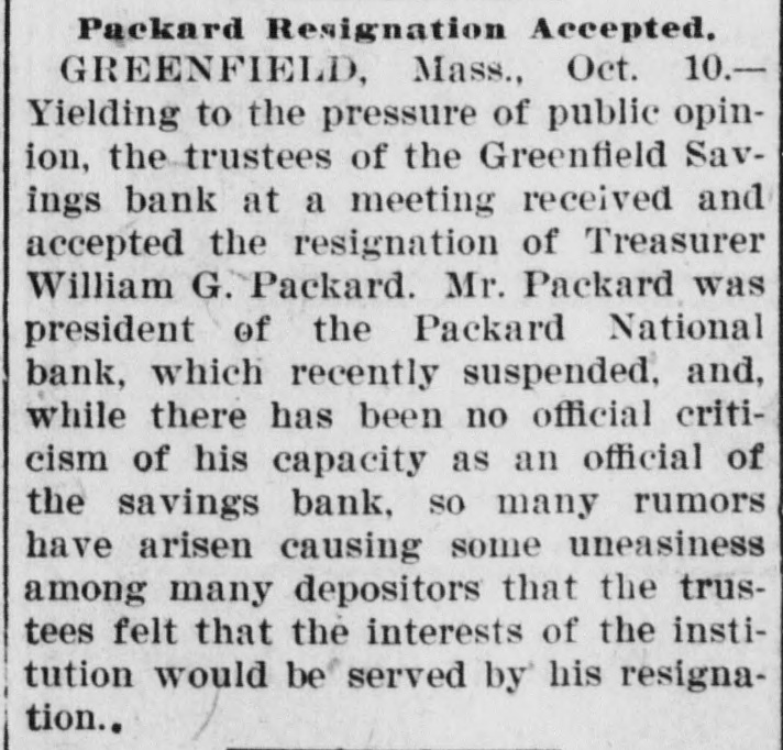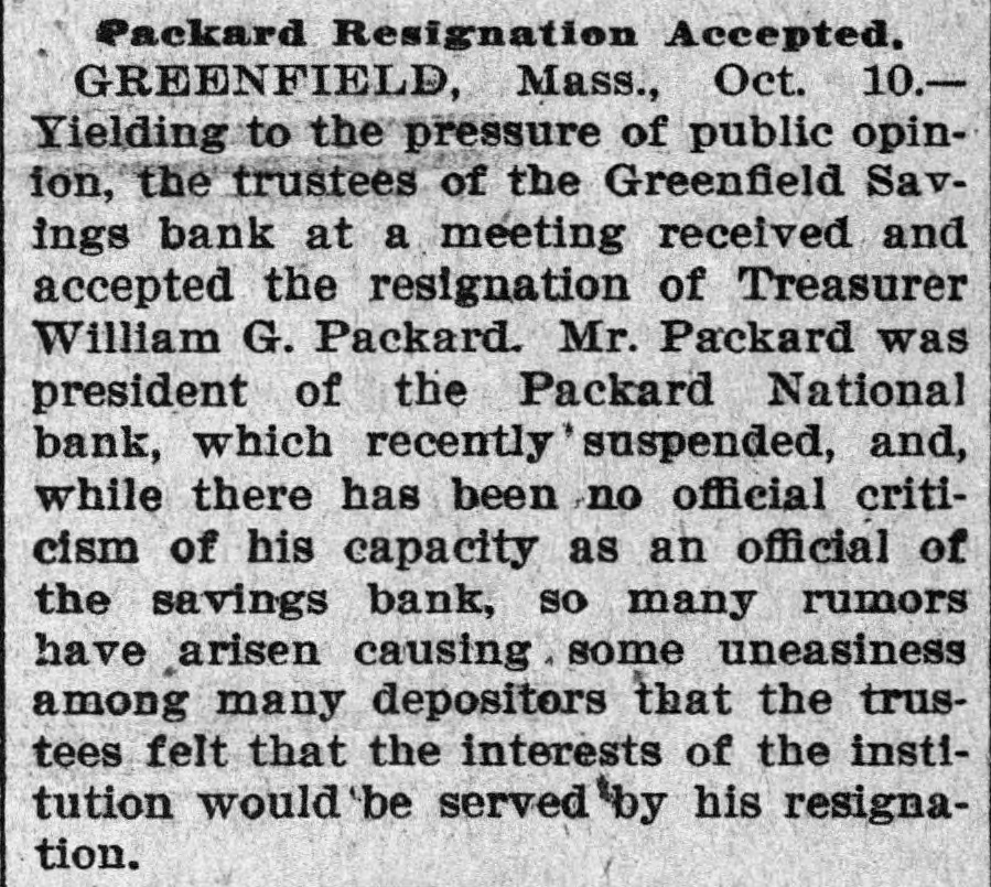 Packard Resignation Accepted. GREENFIELD, Mass., Oct. 10.Yielding to the pressure of public opinion, the trustees of the Greenfield Savings bank at a meeting received and accepted the resignation of Treasurer William G. Packard. Mr. Packard was president of the Packard National bank, which recently suspended, and, while there has been no official criticism of his capacity as an official of the savings bank, SO many rumors have arisen causing some uneasiness among many depositors that the trustees felt that the interests of the institution would be served by his resignation..