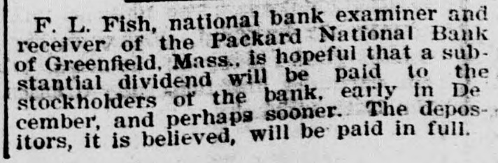 F. L. Fish, national bank examiner and receiver of the Packard National Bank of Greenfield. Mass., is hopeful that a substantial dividend will be paid to the stockholders of the bank, early in De cember, and perhaps sooner. The depositors, it is believed, will be paid in full.