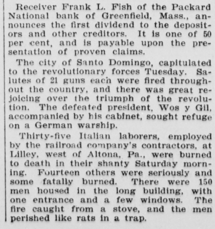 Receiver Frank L. Fish of the Packard National bank of Greenfield, Mass., announces the first dividend to the depositors and other creditors. It is one of 50 per cent, and is payable upon the presentation of proven claims. The city of Santo Domingo, capitulated to the revolutionary forces Tuesday. Salutes of 21 guns each were fired throughout the country, and there was great rejoicing over the triumph of the revolution. The defeated president, Wos y Gil, accompanied by his cabinet, sought refuge on a German warship. Thirty-five Italian laborers, employed by the railroad company's contractors, at Lilley, west of Altona, Pa., were burned to death in their shanty Saturday morning. Fourteen others were seriously and some fatally burned. There were 150 men housed in the long building, with one entrance and a few windows. The fire caught from a stove, and the men perished like rats in a trap.