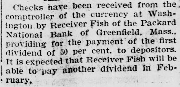 Checks have been received from the comptroller of the currency at Washington by Receiver Fish of the Packard National Bank of Greenfield, Mass., providing for the payment of the first dividend of 50 per cent. to depositors. It is expected that Receiver Fish will be able to pay another dividend in February.