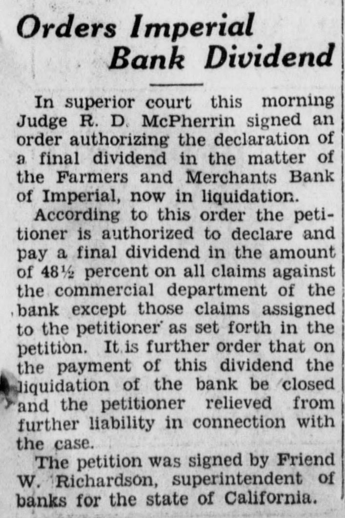 Orders Imperial Bank Dividend In superior court this morning Judge R. D. McPherrin signed an order authorizing the declaration of a final dividend in the matter of the Farmers and Merchants Bank of Imperial, now in liquidation. According to this order the petitioner is authorized to declare and pay a final dividend in the amount of 48 1/2 percent on all claims against the commercial department of the bank except those claims assigned to the petitioner as set forth in the petition. It is further order that on the payment of this dividend the liquidation of the bank be closed and the petitioner relieved from further liability in connection with the case. The petition was signed by Friend W. Richardson, superintendent of banks for the state of California.