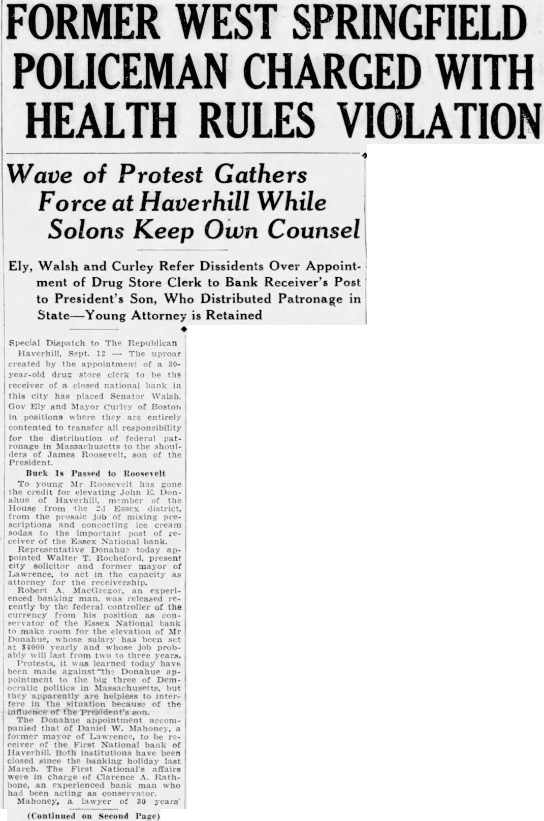 Special to The Springfield Union. HAVERHILL Sept. uproar created the appointment of years-old drugstore clerk be the closed National bank in has placed Senator Gov. Ely and Mayor Curley of Boston in where they are entirely contented to transfer for the distribution of Federal patronto the Roosevelt, son the President. young Mr. Roosevelt has gone the credit for John Donmember the House from the second Essex district, from the prosaic job mixing prescriptions concocting cream sodas post receiver of the National Rocheford Is Appointed. Rep. appointed Walter present city licitor and former Mayor of Law. rence, to act in the capaciay as atterfor Robert an experienced given sack the conptroller from his position Essex National bank to make room for the Donahue, whose salary has set yearly hose probably will last from two Protests, learned yesterday, have been against the the big three of Democratic politics Massachusetts but they apparently are helpless to interfere the of the the The accompanied that Daniel former Mayor of Lawrence, to be ceiver of the First National bank Haverhill. Both been closed since the banking holiday March. The First National's affairs were in charge Clarence Rathwho acting Mahony of years standing. appointed John W. CodJr., of young lawto be attorney for the receiverof First National. Mahony pledged Roosevelt in the election last of the two closed National banks both appointments entirely character They believe that the maining of the two banks pay them greater dividends the receivers were experienced banking men and residents of the city the banks are cated. is entirely objection made cause of his residence in Although Senator declines on the subject of pattronage, has been learned that he does not propose have anything more to with the distribution preferring to maintain the dignity and of his United senator by an attitude silence.