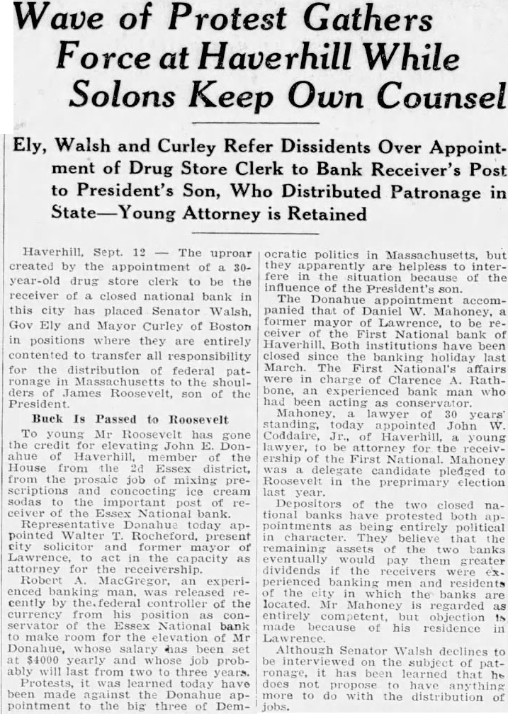 Haverhill, Sept. 18-An uproar created by the appointment of a 30year-old druggist as receiver of closed national bank in Haverhill has placed Senator Walsh. Gov Ely and Mayor Curley in positions where they are entirely content to transfer all responsibility for the distribution of federal patronage in Massachusetts to the shoulders of James Roosevelt, son of the President. To young Mr Roosevelt has gone the for John E. Donahue of member of the House from the second Essex district, from the job of running drug store to the important post of receiver of the Essex National bank. Donahue at one time owned a drug store but recently has been working for another druggist. Representati Donahue appointed Walter T. Rocheford. present city SOlicitor and former mayor of Lawrence, to act in the capacity of attorney for the receivership. Robert A. MacGregor, an experienced banking man, discharged recently by the federal comptroller of the from his position as conservator of the Essex National bank. Donahue's salary has been $4000 yearly and the job probably will last from two to three years. Protests, it was learned, have been made against the Donahue appointment to the big three of Democratic politics in but they ap. parently are helpless to interfere in the situation of the influence of the President's son. The Donahue apopintment accompanied that of Daniel W. Mahony, former mayor of Lawrence, to be receiver of the First National Bank of Haverhill. Both been closed the banking holiday last March. The First National's affairs were in of Clarence A. Rathbone, who had been acting as conser Mahony a lawyer of 30 years' standing. today appointed John Coddaire, of Haverhill, young law. eyr, to be the ship of the First National at Haverhill. Mahony delegate- candidate pledged to Roosevelt in the pre-primary election last year. Depositors of the two closed national banks have protested both appointments as being entirely political in character. They believe that the remaining the two banks eventually pay them greater dividends if the experienced banking men and residents of the city in which the banks are located. Mahony is regarded as entirely competent but objection is made because of his in Lawrence. Although Walsh declines to be interview on the subject of patronage it has been learned that he does not propose to have anything more to do with the distribution of jobs, preferring to maintain the dig nity and prestige of his position as U. S. senator by an attitude of silence. Months ago removed himself from the by turning over all applicatip for federal appointments the President's son. Gov Ely. the national committeeman, has publicly announced his position as non-combatant in the struggle for jobs.