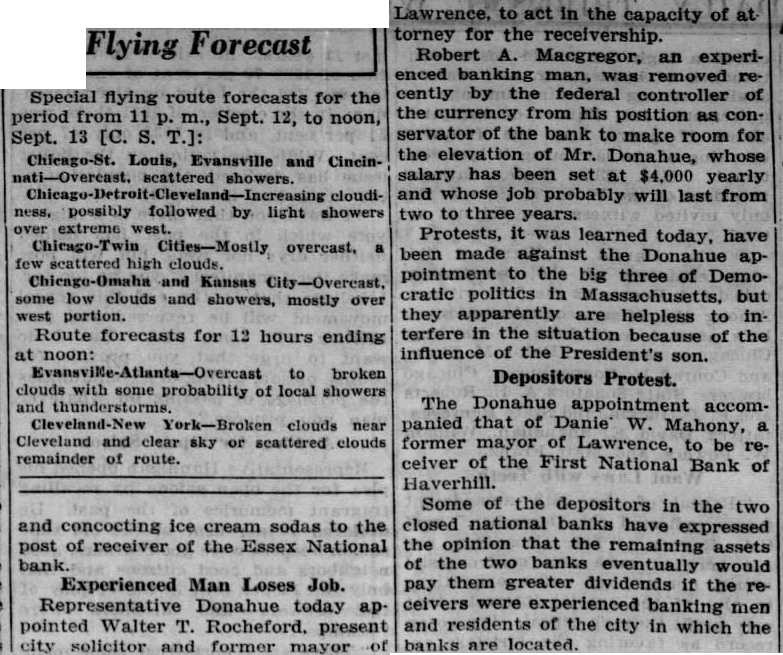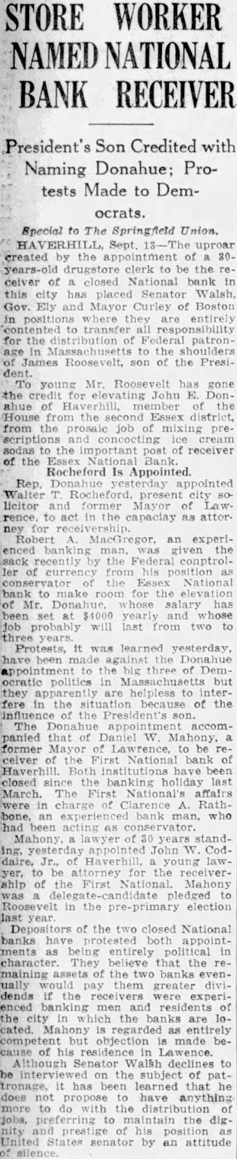 Special to The Springfield Union. Sept. uproar created appointment of drugstore clerk the ceiver closed National bank in this has placed Senator Walsh. Gov. Ely Mayor Curley of Boston positions where entirely transfer for the distribution of Federal patronin Massachusetts to the James Roosevelt, the Presiyoung Mr. Roosevelt has the for John Donthe House from the Essex district, from the prosaic job mixing concocting ice important receiver the Essex Bank. Rocheford Is Appointed. Rep. Donahue Walpresent city solicitor and former Mayor of Lawrence, to act the capacity as attorney for ceivership. Robert MacGregor. an experienced given the sack recently the from his position as the Essex National bank to make room for the elevation whose salary has $4000 yearly will last from two years.