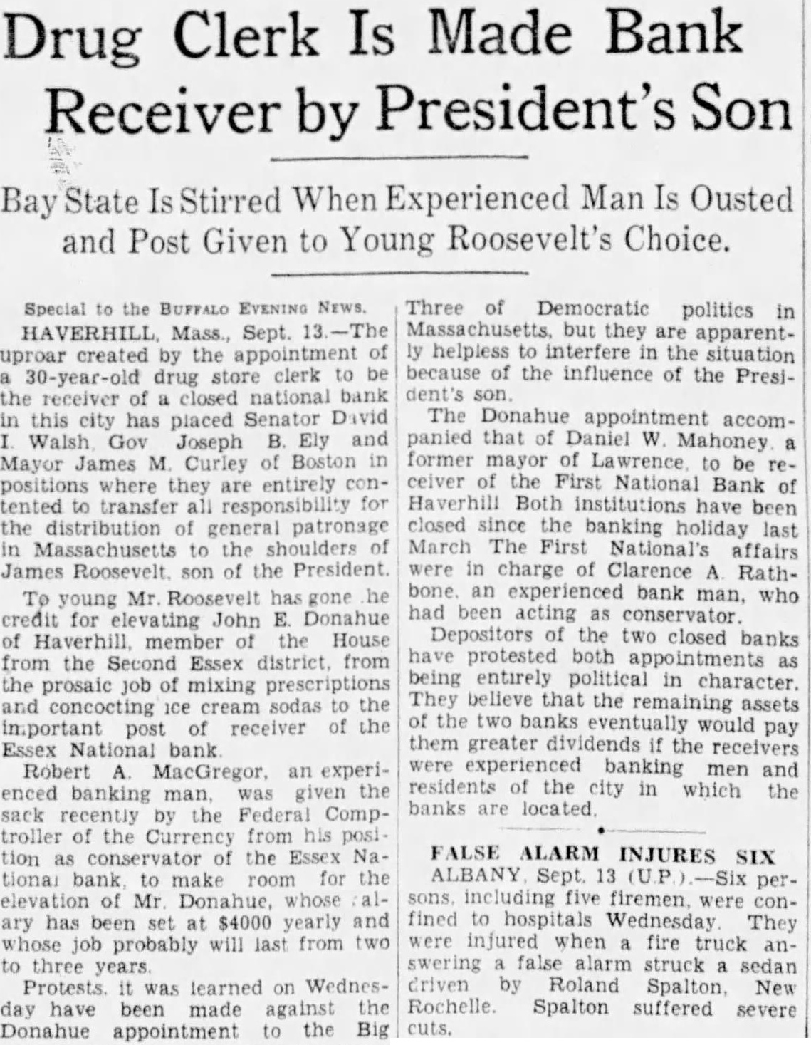 Special to BUFFALO EVENING NEWS HAVERHILL Mass. Sept. uproar created appointment 30-year-old drug store clerk to be the receiver of closed national bank this city has placed Senator David Walsh Gov Joseph Ely and Mayor M. Curley of Boston positions where they are entirely contented to transfer responsibility for the distribution general patronage in Massachusetts to the shoulders of James Roosevelt son of the President To young Mr Roosevelt has gone he credit for elevating John Donahue of Haverhill, member the House from the Second Essex district from the prosaic job mixing prescriptions and ice cream sodas to the important receiver of the Essex bank Robert MacGregor an experienced banking man. given the sack recently by the Federal Comptroller the Currency from his position conservator the Essex Naroom for the Mr Donahue whose ary has $4000 yearly and whose job probably will last from two to three years Protests. was learned on Wednesday have been made against Donahue appointment to the Big