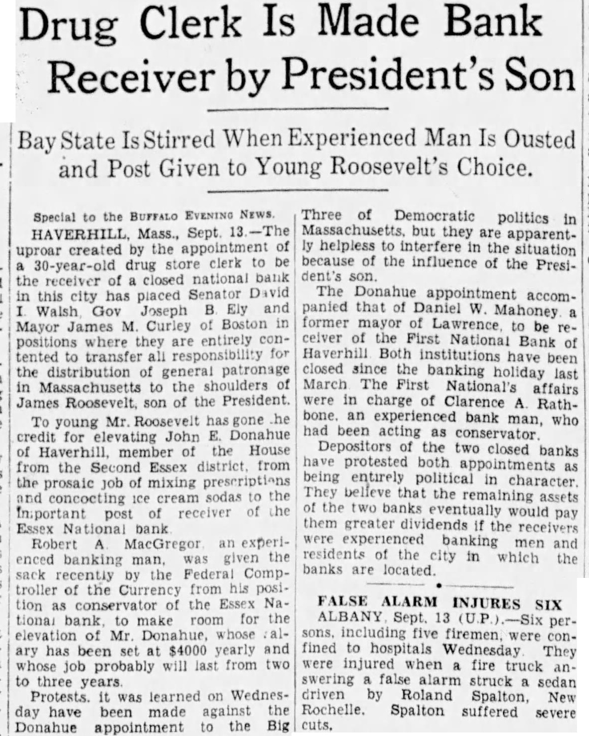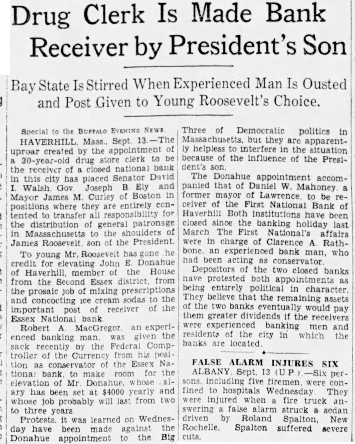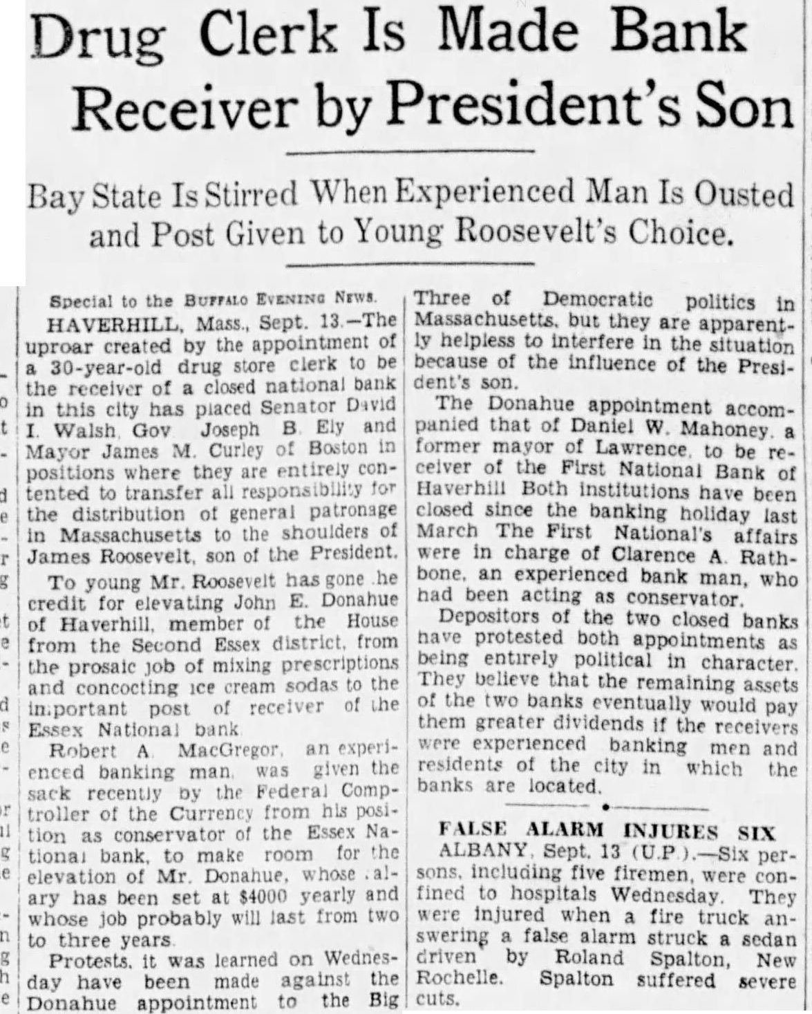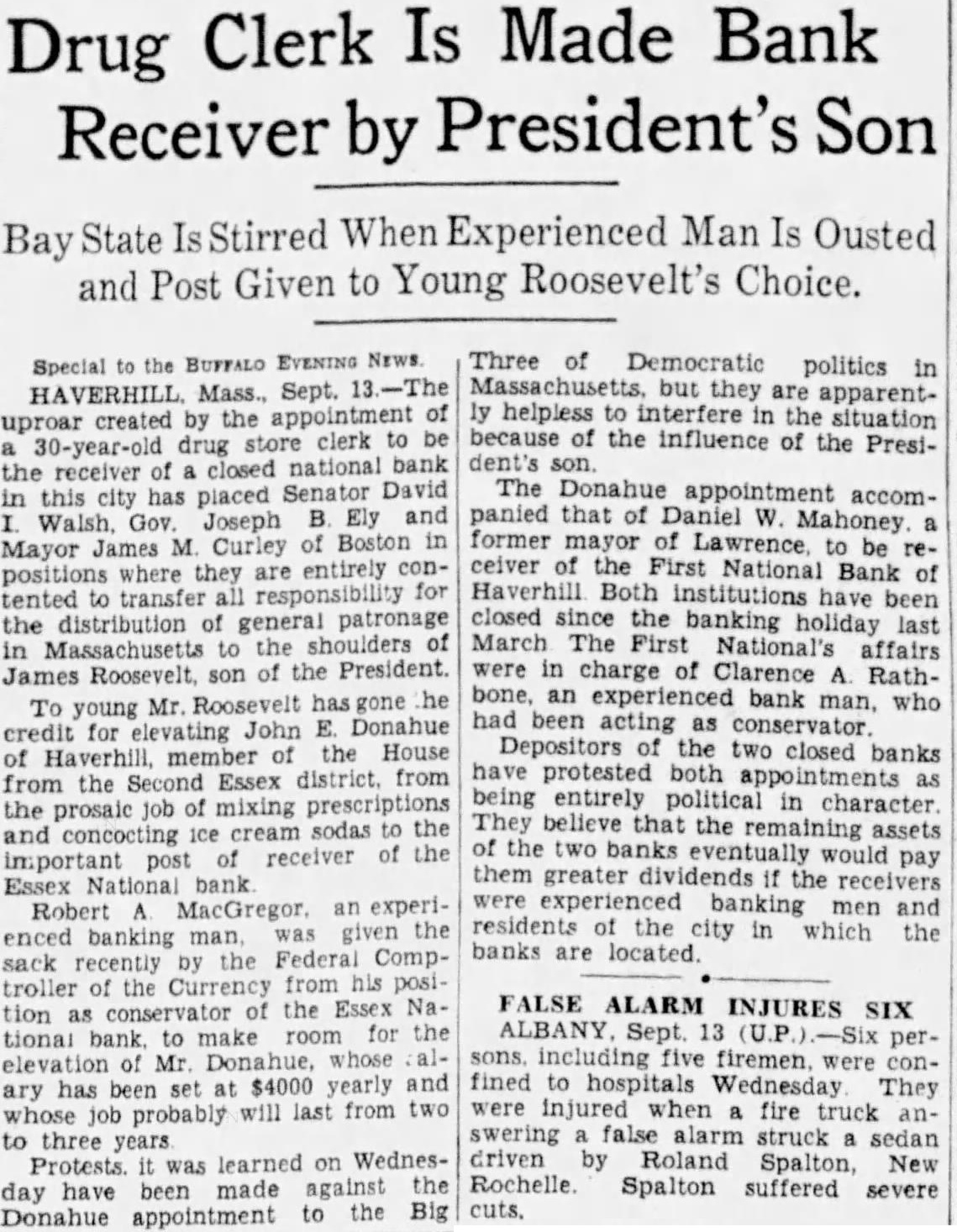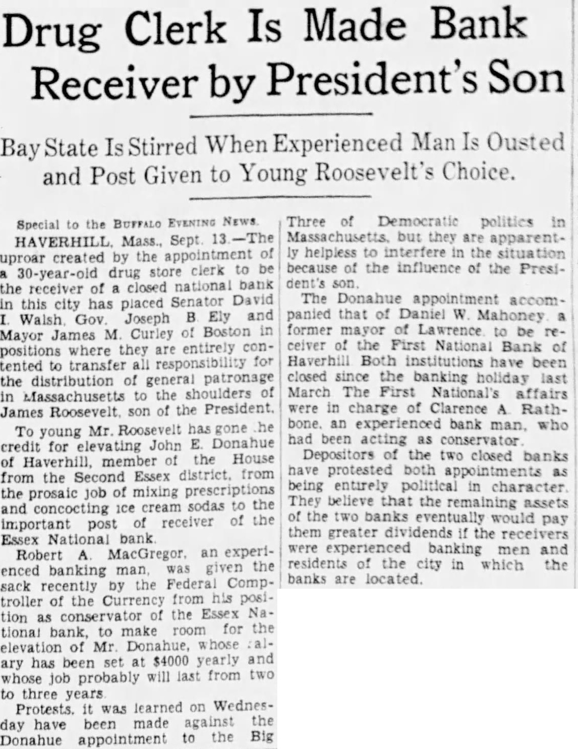 Special BUFFALO EVENING NEWS. HAVERHILL Mass., Sept. uproar created the appointment 30-year-old drug store clerk to be the receiver of closed national bank in this city has placed Senator David Walsh. Gov. Joseph B. Ely and Mayor James M. Curley of Boston in positions where they are entirely contented transfer for the of patronage in Massachusetts the of James Roosevelt son of the President. To young Mr Roosevelt has gone he credit for John Donahue member of the House of from the Second Essex district from the prosaic job mixing prescriptions sodas to the and concocting receiver of the important post Essex bank Robert MacGregor. an experienced banking man, given the sack recently the Federal Comptroller of the Currency from his position as conservator the Essex National bank. to make room for the elevation Mr Donahue, whose ary has been set $4000 yearly and job probably will last from two to three Protests was learned on Wednesday have been made against the to the Big Donahue appointment