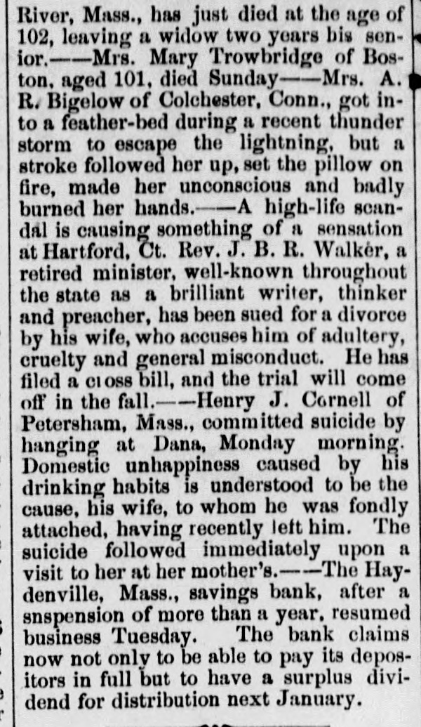 River, Mass., has just died at the age of 102, leaving a widow two years bis senior.-Mrs. Mary Trowbridge of Boston, aged 101, died Sunday-Mrs. A. R. Bigelow of Colchester, Conn., got into a feather-bed during a recent thunder storm to escape the lightning, but a stroke followed her up, set the pillow on fire, made her unconscious and badly burned her hands.-A high-life scandal is causing something of a sensation at Hartford, Ct. Rev. J. B. R. Walker, a retired minister, well-known throughout the state as a brilliant writer, thinker and preacher, has been sued for a divorce by his wife, who accuses him of adultery, cruelty and general misconduct. He has filed a CLOSS bill, and the trial will come off in the fall.-Henry J. Cornell of Petersham, Mass., committed suicide by hanging at Dana, Monday morning. Domestic unhappiness caused by his drinking habits is understood to be the cause, his wife, to whom he was fondly attached, having recently left him. The suicide followed immediately upon a visit to her at her mother's.-The Haydenville, Mass., savings bank, after a snspension of more than a year. resumed business Tuesday. The bank claims now not only to be able to pay its depositors in full but to have a surplus dividend for distribution next January.