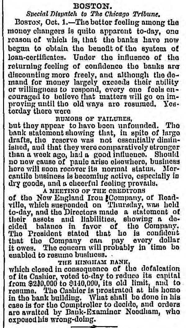THE SITUATION ELSEWHERE. CONDITION OF THE BOSTON BANKS-AN IMPROVING STOCK MARKET-EFFECT OF A BANK DEFALCATION ON HARTFORD AND ERIE-RESULTS OF THE MONEY STRINGENCY IN MANUFACTURES AND TRADE. [BY TELEGRAPH TO THE TRIBUNE. BOSTON, Sept. 30.-The full benefit of the loan certificate arrangement is not yet felt, for the plan is not yet in full working order. The banks were lable to discount more generally than heretofore, but the available supply of money has, of course, been inadequate. In the course of a day or two, however, everything will be adjusted, and it is not anticipated that there will be a lack of currency then. The discounting of the banks to-day has only been to meet urgent necessity, and outside the best paper has gone begging. The bank statement reflects the struggles of the past week. Their available resources have been drawn away to the extent of some $5,000,000; deposits have been drawn down $3,369,700; balances due other banks, $1.753.800; circulation. $4,700. To meet this, loans have been reduced $2,275,000; balances due other banks, $2,516,000. The legal reserve has been diminished less than half a million, and the banks are relatively stronger than before the panic. Stocks sold higher; railroads gaining from one to three per cent (Michgan Central gaining the latter figure), and mining stocksfrom one to five. Late in the afternoon. after the closing of the Board, there was a bad break in Hartford and Eric 78, caused by the discovery that Lovett, the defaulting cashier of the Hingham Bank, had been speculating in them. Prices at the Board ruled at 24 to 25; but 20,000 were thrown on the market then, and the price went down to 22-the lowest price for years. No steps have yet been taken for the arrest of the cashier. and at last accounts he was still at the bank. The depositors will lose nothing. and the directors will reduce the capital and continue. One of the curious features of the pante has been the unusual amount of exports for the past week and the large receipts of breadstuffs. The receipts of flour show au increase of 5.284 barrels, and of corn 78.000 bushels over the previous week. The exports for the past three days have amounted to over $800,000, more than for any three days of the present year. Manufacturers have not been seriously embarrassed, and do not anticipate any more trouble. J.1 P. Squire & Co., large pork packers, having about 1,000 employés, were slightly embarrassed, and discharged about 100 men. but will take them back at an early day. The American Watch Company and the Howard Watch Company are the only other prominent manufacturers that make any reduction in their force. The Hinckley Locomotive Works employs 500 men. and asits present orders re-nearly all for the Chicago, Danville and Vincennes, and the Atlantic and Pacific roads, it expects no trouble from the panic. PHILADELPHIA FAILURES-STATEMENT OF CLARK & CO. PHILADELPHIA, Sept. 30.-A meeting of the creditors of E. W. Clark & Co. was held to-day. A statement was made. showing as follows; $1,042,526 Liabilities secured 1.041.498 Liabilities unsecured $2,084,024 Total Assets. including stocks, bonds, loans. bills receiva2,464,355 ble, and other securities and real estate $380,331 Leaving a surplus of A committee of three was appointed to investigate the affairs of the concern. The meeting was unanimously in favor of rendering proper aid to the firm in its efforts to realize on its assets and make settlements with its creditors, believing that their own interests would not suffer by pursuing such a course. The report that the firm of Martin, Londenberger & Co. had suspended is contradicted. Harrison Grambo, who failed 80 disastrously nearly a year since, has resamed business, having settled nearly $900,000 of his liabilities. STRANGE CONDUCT OF A KANSAS BANK OFFICERSUSPENDED BANKS REOPENED. LEAVENWORTH, Sept. 30.-There is mueh indignation among the stockholders and dépositors of the First National Bank, *in this city, in consequence of the Vice-President ordering the bank to suspend, and at the same time drawing nearly $100,000 in currency to sustain n the credit of Scott & Co., brokers. of which firm the Vice-President, Lyman Scott. is a partner. The German Savings Bank, and Insley, Shire & Co., bankers. reopened yesterday. and are abundantly able to meet all demands. Other banks here are paying checks in limited sums. FINANCIAL EXCITEMENT IN GERMANY-THE BULLION MOVEMENT. LONDON, Sép. 30.-A special dispatch from Berlin hints at financial troubles in Germany. Fancy stocks and bank shares are not salable, and some have fallen as much as 20 per cent. There is some talk of Government interference. The £50,000 drawn from the Bank of England on balance, to-day, is to be shipped to New-York. The steamship Donau, which sails from Southampton for New York to-day, also took £136,000 in bullion. LATER.-The Gazette publishes a notice for a meeting of the creditors of Clews, Habieht & Co. on Nov. 23. The steamer Parthia, which sailed to-day for New-York, took $100,000 in bullion. FINANCIAL NOTES. There was no particular change in the financial situation at Cincinnati yesterday. Harrisburg manufacturers approve the action of the banks of that city in adopting the certified check plan. The banks of Memphis have resolved not to suspend, but to open, in addition to the usual business, an exchange account. to be paid in kind, for the purpose of moving cotton. Responsible merchants have subscribed and paid in $320,000 to the First National Bank, which will enable it to resume business at once. The Providence banks adopted, yesterday, a report recommending a liberal policy on the part of banks toward each other and customers; that each bank should request its depositors to draw checks payable through the Clearing-house, and should certify checks payable through the Clearing-house; that deposits made in banks in currency be paid out to such depositors in currency, and that deposits made in certified checks be p