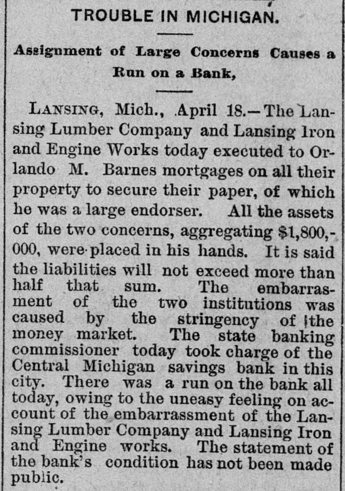 Run was triggered by the mortgage/embarrassment of two large local firms (Lansing Lumber Company and Lansing Iron & Engine Works) whose paper the bank held.
