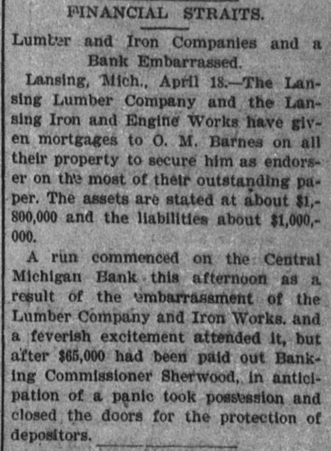 FINANCIAL FLURRY. The Failure of Two Leading Industries at Lansing, Mich., Causes a Bank to Close Its Doors, LANSING, Mich., April 19.-There has been a considerable flurry of excitement. in financial circles in central Michigan during the past two days, caused by the embarrassment of the Lansing Iron and Engine Works and the Lansing Lumber Company, two leading manufacturing institutions of this city. A crisis was reached yesterday when the institutions named filed mortgages upon their real and personal property to the amount of $701,000 in favor of Orlando M. Barnes, who has indorsed a large amount of their paper. A feeling of insecurity at once arose among the depositors of certain banks which have been dealing in the paper of the companies mentioned and a sudden and wholly unexpected run was made upon the Central Michigan Savings bank. After meeting all the demands of depositors for several hours, Cashier Bradley, upon the advice of State Banking Commissioner Sherwood an o'clock Tuesday afternoon, closed the doors of the bank. The state banking commissioner is now in charge. The managers of the bank maintain that the institution is perfecty solvent and in a few days its doors will be reopened.