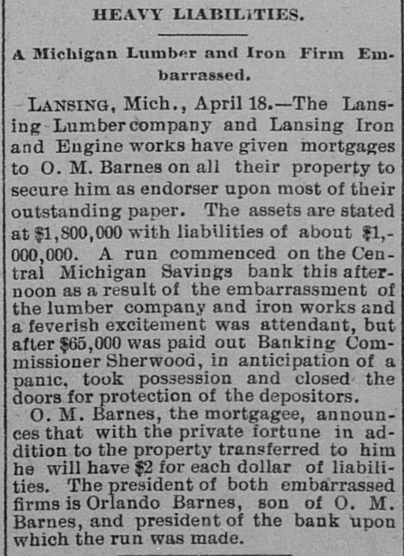 IN FINANCIAL TROUBLE. A Lumber Company and Iron Works Mortgage Their Property. LANSING (Mich.), April 18.-The Lansing Lumber Company and Lansing Iron and Engine Works given mortgages to O. M. Barnes on all of their property, to secure him as indorser on most of their outstanding paper. The assets are stated at about $1,800,000, with liabilities of about $1,000,000. A run commenced on the Central Michigan Savings this afternoon as a result of the embarrassment of the lumber company and iron works, and feverish excitement was attendant, but after $65,000 was paid out Banking Commissioner Sherwood, in anticipation of a panic, took possession and closed the doors for the protection of depositors. O. M. Barnes, the mortgagee, announces that with his private fortune, in addition to property transferred to him, he will have $2 for each dollar of liabilities. The President of both embarrassed firms is Orlando F. Barnes, son of O. M. Barnes, and he is President of the bank upon which the run was made.