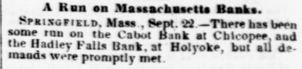 A Run on Massachusetts Banks. SPRINGFIELD, Mass., Sept. 22.-There has been some run on the Cabot Bank at Chicopee, and the Hadley Falls Bank, at Holyoke, but all demands were promptly met.
