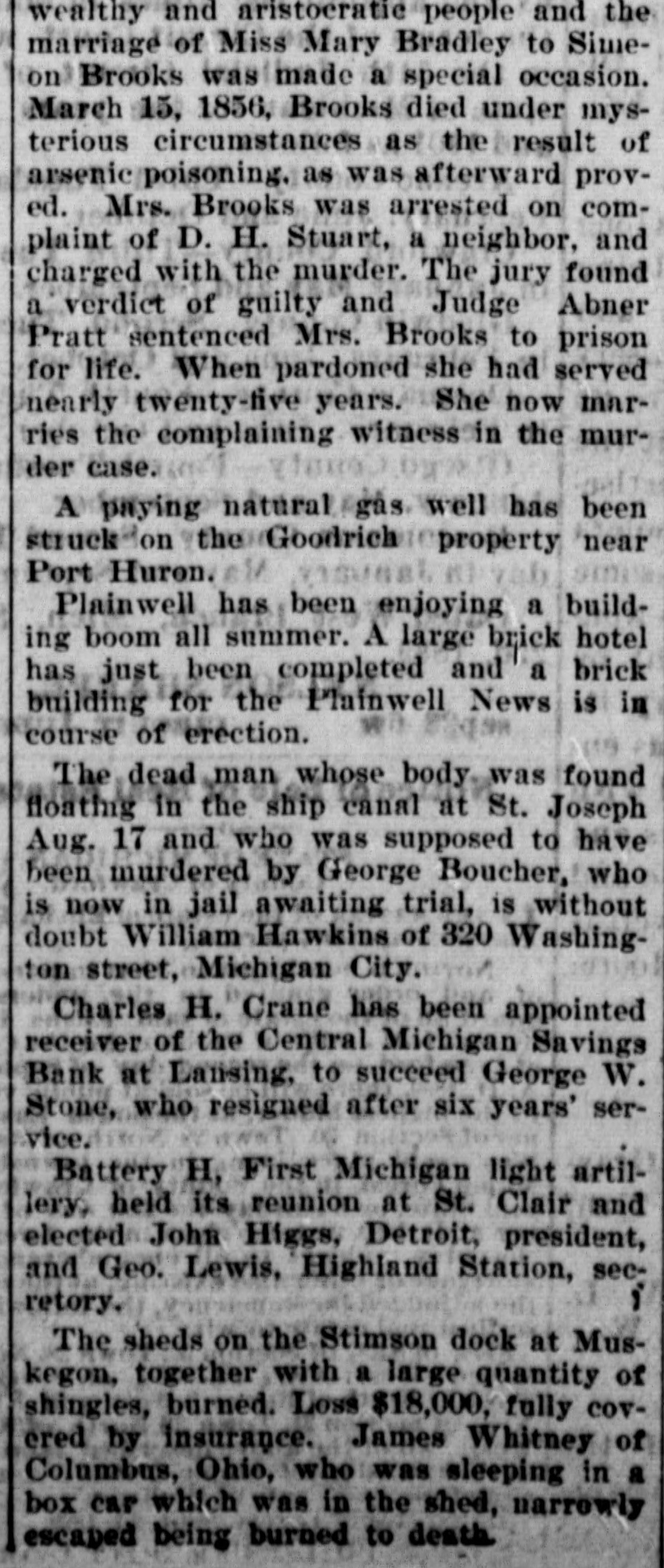 wealthy and aristocratic people and the marriage of Miss Mary Bradley to Simeon Brooks was made a special occasion. March 15, 1856, Brooks died under mysterious circumstances as the result of arsenic poisoning. as was afterward proved. Mrs. Brooks was arrested on complaint of D. H. Stuart, a neighbor, and charged with the murder. The jury found a verdict of guilty and Judge Abner Pratt sentenced Mrs. Brooks to prison for life. When pardoned she had served nearly twenty-five years. She now marries the complaining witness in the murder case. A paying natural gas well has been struck on the Goodrich property near Port Huron. Plainwell has been enjoying a building boom all summer. A large brick hotel has just been completed and a brick building for the Plainwell News is in course of erection. The dead man whose body was found floating in the ship canal at St. Joseph Aug. 17 and who was supposed to have been murdered by George Boucher, who is now in jail awaiting trial, is without doubt William Hawkins of 320 Washington street, Michigan City. Charles H. Crane has been appointed receiver of the Central Michigan Savings Bank at Lansing, to succeed George W. Stone, who resigned after six years' service. Battery H, First Michigan light artillery, held its reunion at St. Clair and elected John Higgs, Detroit, president, and Geo. Lewis, Highland Station, secretory. The sheds on the Stimson dock at Muskegon, together with a large quantity of shingles, burned. Loss $18,000, fully covcred by insurance. James Whitney of Columbus, Ohio, who was sleeping in a box car which was in the shed, narrowly escaped being burned to death.