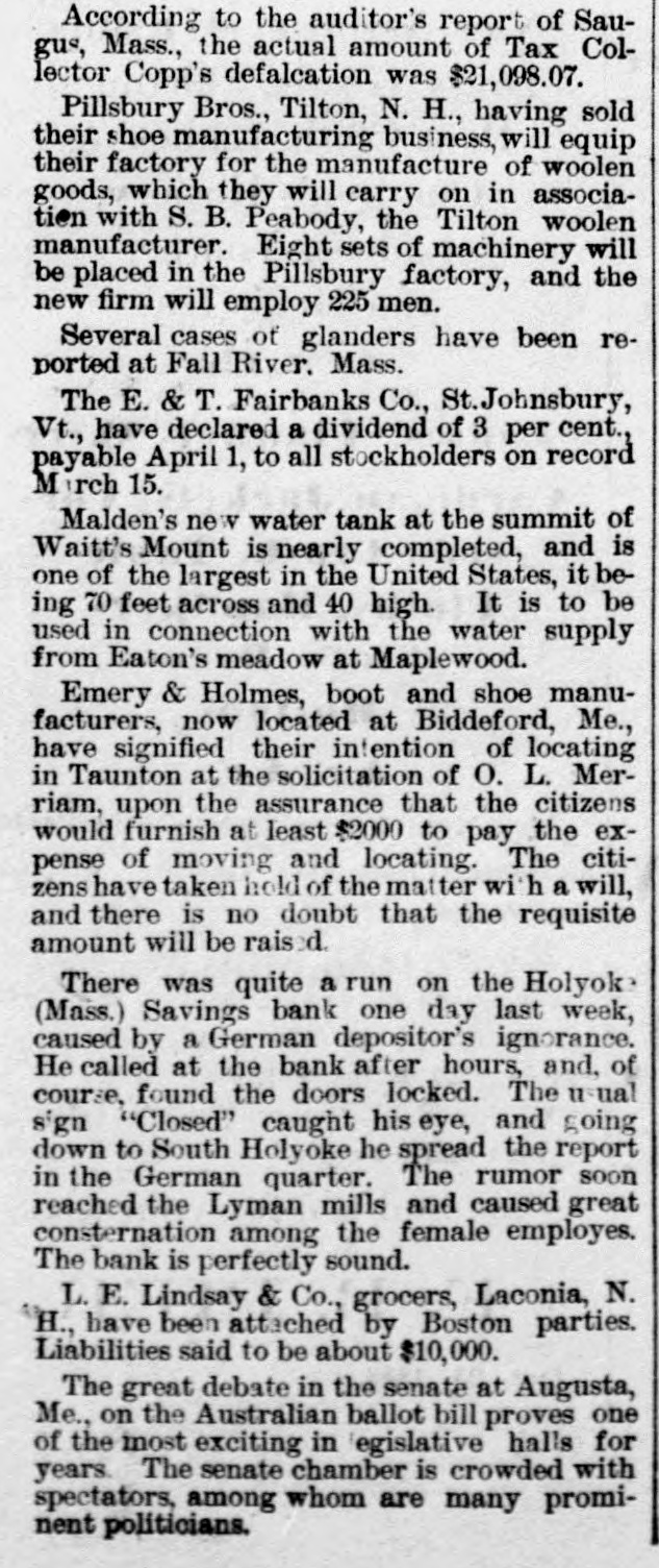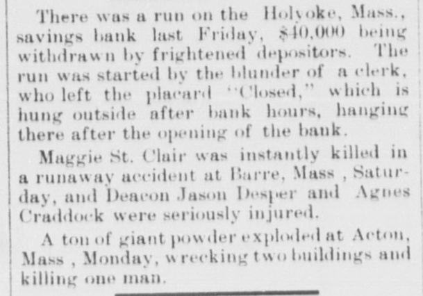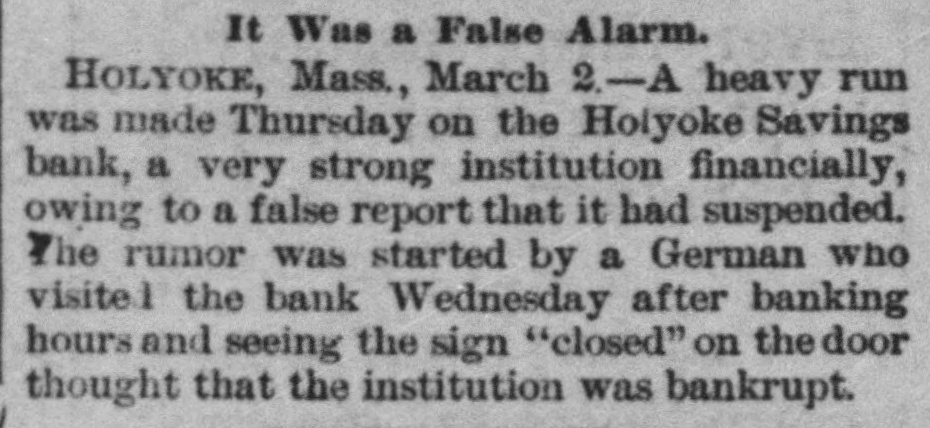 There was quite a run on the Holyok (Mass.) Savings bank one day last week, caused by a German depositor's ignorance. He called at the bank after hours, and, of course, found the doors locked. The usual sign "Closed" caught his eye, and going down to South Holyoke he spread the report in the German quarter. The rumor soon reached the Lyman mills and caused great consternation among the female employes. The bank is perfectly sound.
