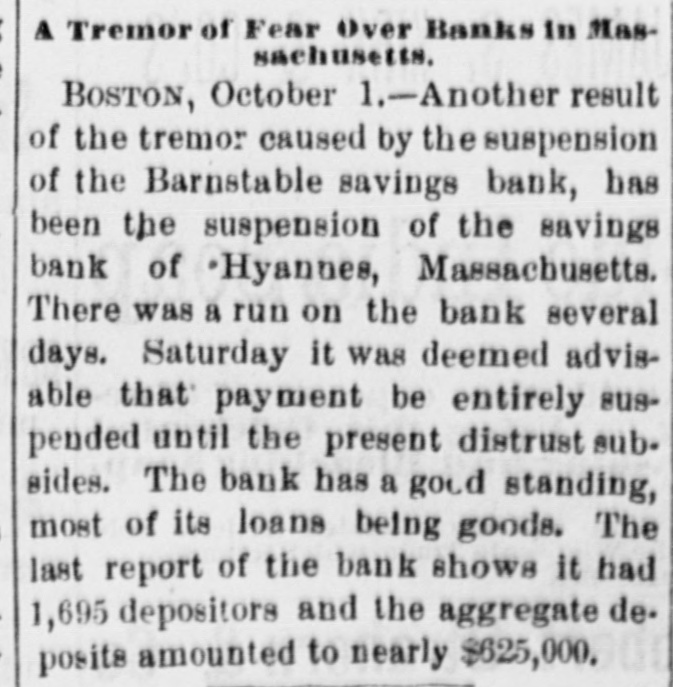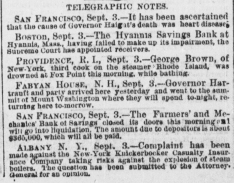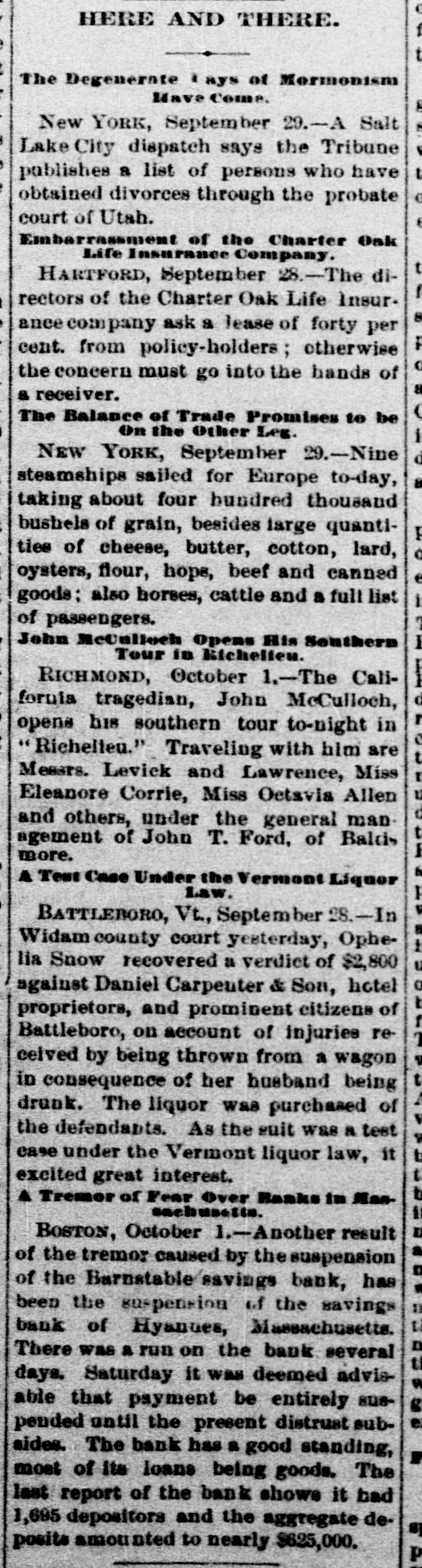 € HERE AND THERE. f t The Degenerate . ays of Mermonism Have Come. g 8 New YORK, September 29.-A Salt y Lake City dispatch says the Tribune t publishes a list of persons who have 0 obtained divorces through the probate court of Utah. & Embarrassment of the Charter Oak Life Insurance Company. t HARTFORD, September 28.-The di1 rectors of the Charter Oak Life Insur8 ancecompany ask a lease of forty per I cent. from policy-holders ; otherwise o the concern must go into the hands of a a receiver. ( The Balance of Trade Promises to be On the Other Leg. I NEW YORK, September 29.-Nine o steamships sailed for Europe to-day, a taking about four bundred thousand bushels of grain, besides large quantiI ties of cheese, butter, cotton, lard, o oysters, flour, hops, beef and canned e goods; also horses, cattle and a full list I of passengers. 1 John McCulloch Opens His Southern I Tour in Richelieu. RICHMOND, October 1.-The Calio foruia tragedian, John McCulloch, , opens his southern tour to-night in 'Richelleu." Traveling with him are t I Messrs. Levick and Lawrence, Miss ti Eleanore Corrie, Miss Octavia Allen 0 and others, under the general mant agement of John T. Ford, of Balds more. b A Test Case Under the Vermont Liquor Law. I 9 BATTLEBORO, Vt., September 28.-In a Widam county court yesterday, Ophet u lia Snow recovered a verdict of $2,800 0 against Daniel Carpenter & Son, hotel proprietors, and prominent citizens of f Battleboro, on account of injuries re1 V celved by being thrown from a wagon t in consequence of her husband being drunk. The liquor was purchased of V the defendants. As the suit was a test y t case under the Vermont liquor law, it t excited great interest. to & Tremor of Fear Over Banks in Mansachusetts. II BOSTON, October 1.-Another result of the tremor caused by the suspension a of the Barnstable/savings bank, has II been the suspension of the savings L bank of Hyanues, Massachusetts. n There was a run on the bank several ti days. Saturday it was deemed advisable that payment be entirely sueg pended until the present distrust subsides. The bank has a good standing, IF most of Its loans being goods. The last report of the bank shows it bad 1,695 depositors and the aggregate de8] posits amounted to nearly $625,000. P