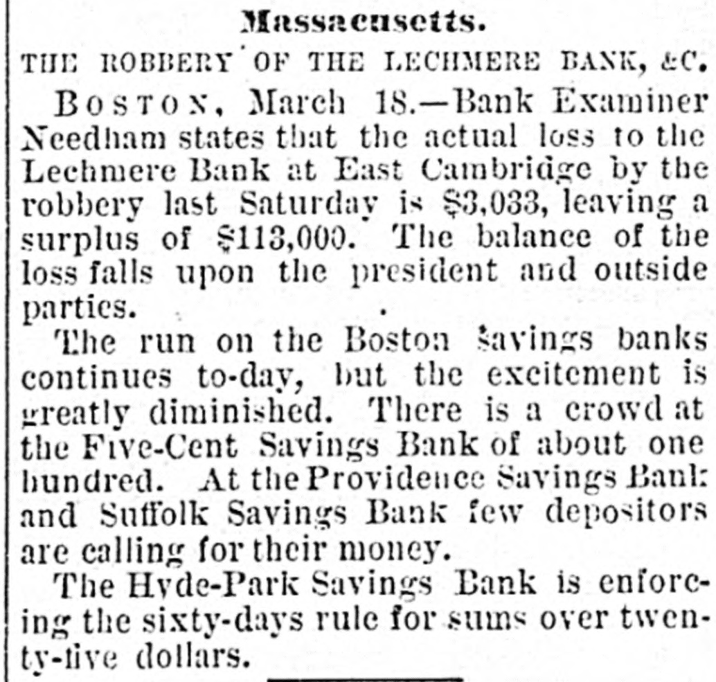 Banksand Bankers. MONTREAL, CAN., March 18.-In asuit against the ex-directors of the Metropolitan Bank to recover damages for their mismanagement, it is alleged in the proceedings that the statements of the bank, from four to six years ago, were false; that the directors borrowed over a half a million dollars, and need the money for stock speculations. BOSTON, March 18-Bank Examiner Needham states that the actual loss to the Leichmere Bank, at East Cambridge, by robbery last Saturday, amounts to $3,038, leaving a surplus of $113,000. The balance of the loss falls upon the President and outside parties. The run on the Savings Banks to day continues, but the excitement is greatly diminished, and the crowd in the Five Cent Savings Bank did not number over one hundred. At the Provident and Soffolk Savings Banks there were few if any depositors calling for their money. REQUIRES THE BIXTY DAY NOTICE. The Hyde Park Savings bank requires sixty days notice before paying sums over twenly. five dollars.