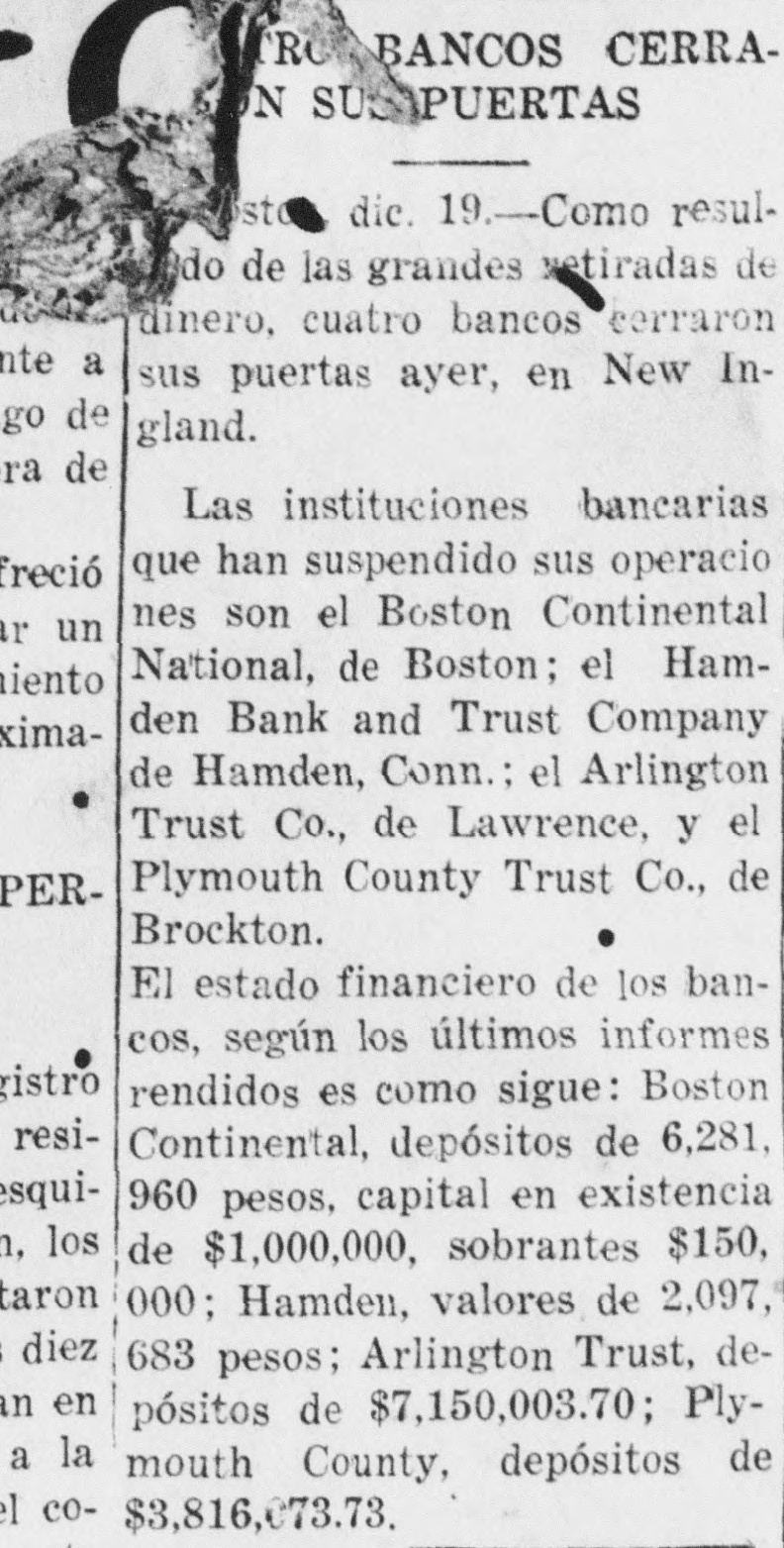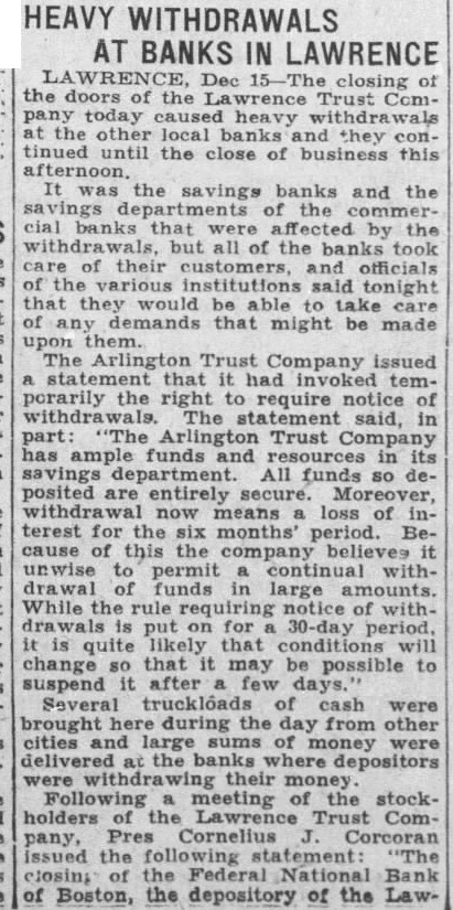 HEAVY WITHDRAWALS AT BANKS IN LAWRENCE Dec of the the Trust Company today heavy the other local and they tinued until the close of business this savings banks and the cial banks that affected by the withdrawals, all of the banks took customers, and officials of said tonight that take of demands that might be made The Arlington Trust Company issued statement that it had temporarily the right to require notice statement said, in part: "The Arlington Trust has ample funds and resources in its savings department. All funds so deposited are entirely Moreover, means loss of terest for six months' period Because of this the company unwise permit continual withdrawal funds large While the requiring withput 30-day period. is likely that conditions will change that it may be possible to suspend it after few Several truckloads of cash were brought during the day from other cities and of were the banks depositors their Following meeting of the stockholders of the Lawrence Trust Company, Pres Cornelius Corcoran issued the closing the Federal National Bank of Boston, the depository of the Law-