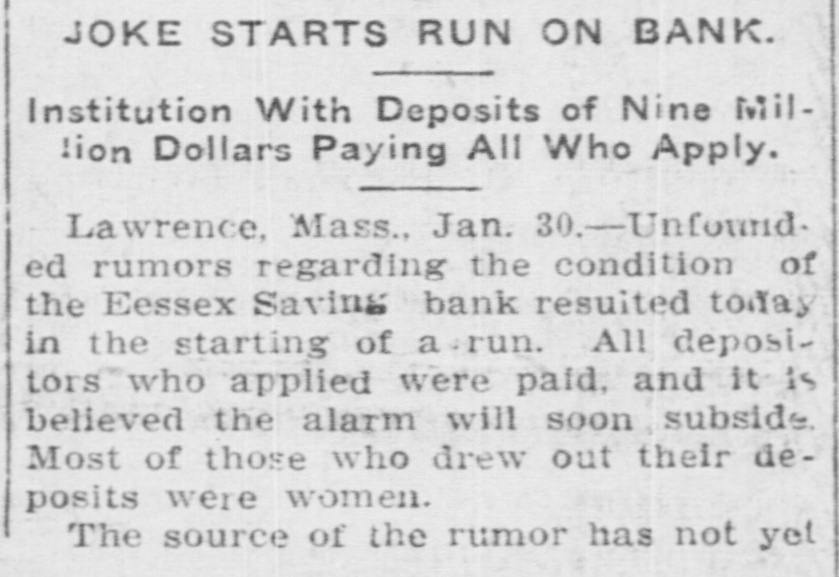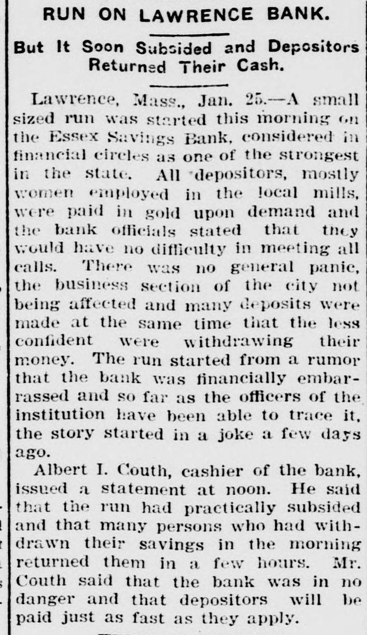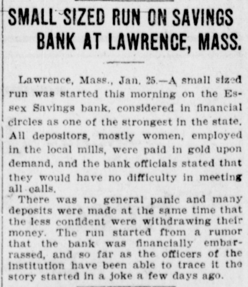 SMALL SIZED RUN ON SAVINGS BANK AT LAWRENCE, MASS. Lawrence, Mass., Jan. 25.-A small sized run was started this morning on the Essex Savings bank, considered in financial circles as one of the strongest in the state, All depositors, mostly women, employed in the local mills, were paid in gold upon demand, and the bank officials stated that they would have no difficulty in meeting all calls, There was no general panic and many deposits were made at the same time that the less confident were withdrawing their money. The run started from a rumor that the bank was financially embarrassed, and so far as the officers of the institution have been able to trace it the story started in a joke a few days ago.