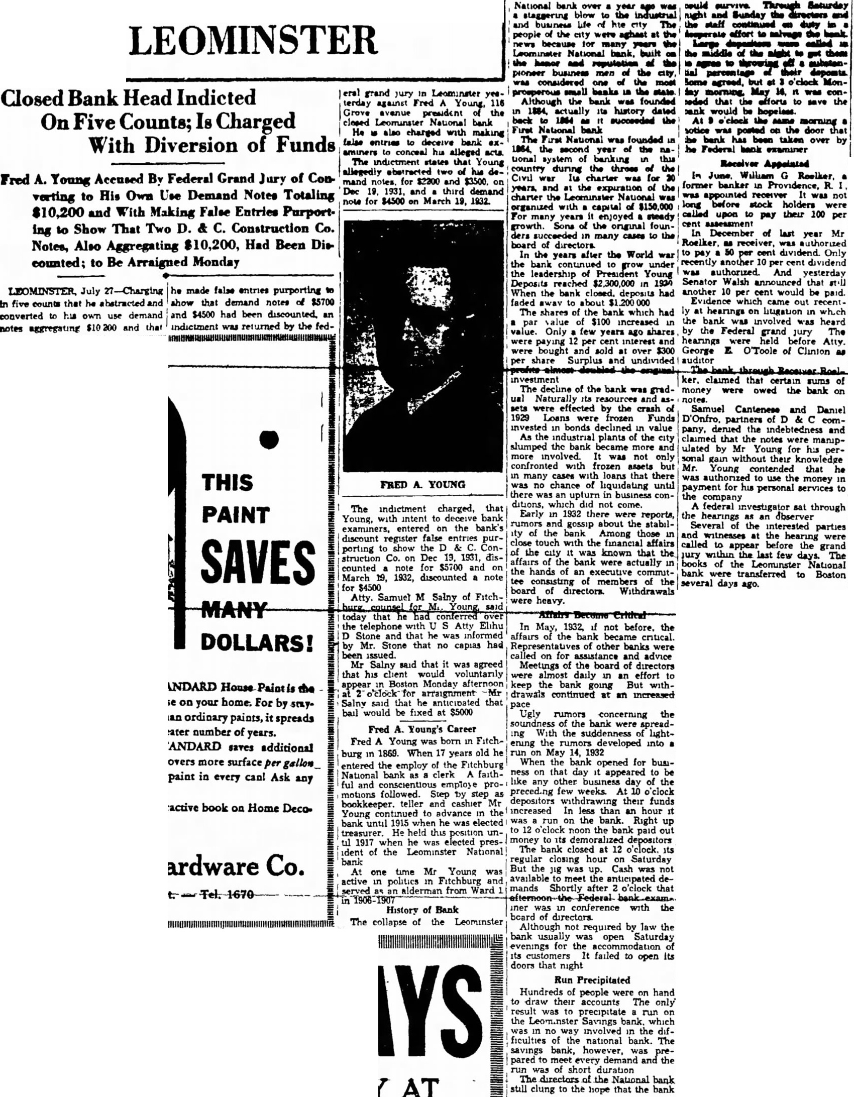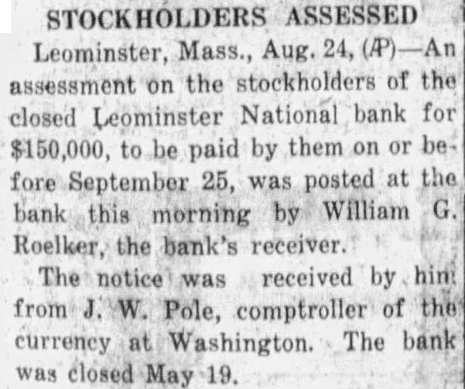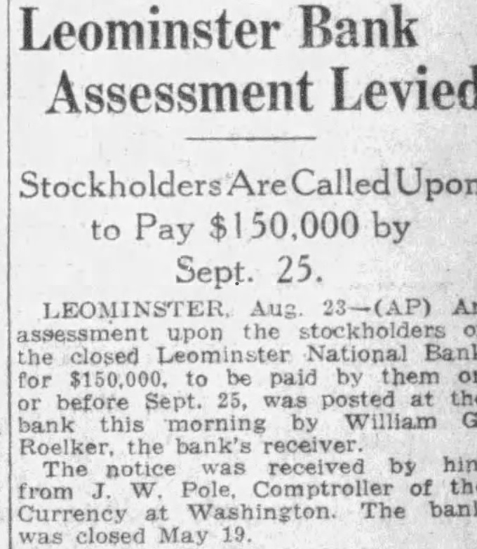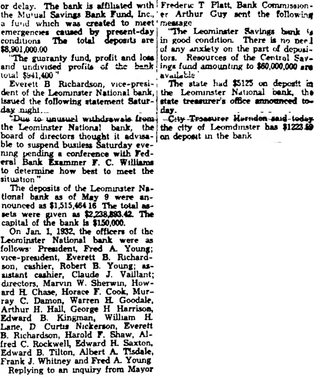 The bank is affiliated with or delay. the Mutual Savings Bank Fund, Inc., fund which was created to meet emergencies caused by present-day conditions The total deposits are $8,901,000.00 The guaranty fund, profit and loss and undivided profits of the bank total Everett B Richardson, vice-president of the Leominster National bank, Issued the following statement Saturday Due unusual withdrawal from the Leominster National bank, the board of directors thought it advisable to suspend busiless Saturday evening pending conference Federal Bank Exammer C. Williams to determine how best to meet the situation The deposits of the Leominster National bank as of were announced as The total sets given as $2,238,893.42 The capital of the bank is $150,000. On Jan. 1932, the officers of the Leominster National bank were follows President, Fred A. Young; vice-president, Everett B. Richardson, cashier, Robert B. Young; sistant cashier, Claude Vallant; directors, Marvin W. Sherwin, Howard H Chase, Horace F. Cook, Murray C. Damon, Warren H. Goodale, Arthur H. Hall, George H Harrison, Edward B. Kingman, William H. Lane, D Curtis Nickerson, Everett B. Richardson, Harold F. Shaw, Alfred C. Rockwell, Edward H. Saxton, Edward B. Tilton, Albert A. Tisdale, Frank Whitney and Fred A. Young Replying to an inquiry from Mayor