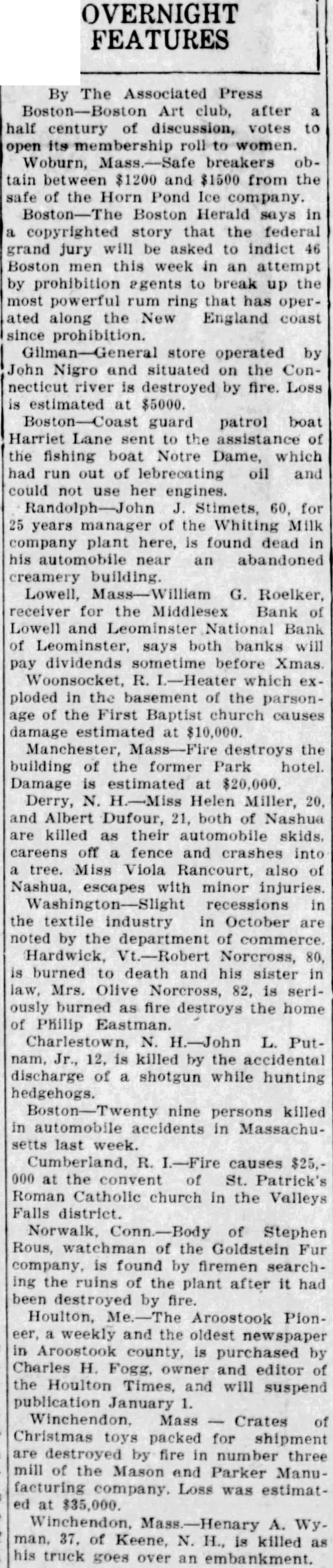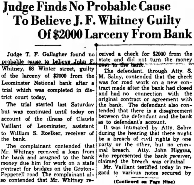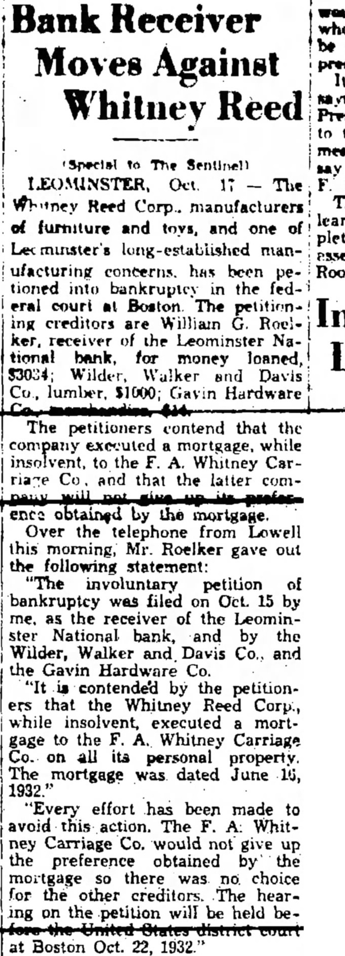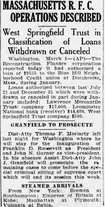 The bank is affiliated with or delay. the Mutual Savings Bank Fund, Inc., fund which was created to meet emergencies caused by present-day conditions The total deposits are $8,901,000.00 The guaranty fund, profit and loss and undivided profits of the bank total Everett B Richardson, vice-president of the Leominster National bank, Issued the following statement Saturday Due unusual withdrawal from the Leominster National bank, the board of directors thought it advisable to suspend busiless Saturday evening pending conference Federal Bank Exammer C. Williams to determine how best to meet the situation The deposits of the Leominster National bank as of were announced as The total sets given as $2,238,893.42 The capital of the bank is $150,000. On Jan. 1932, the officers of the Leominster National bank were follows President, Fred A. Young; vice-president, Everett B. Richardson, cashier, Robert B. Young; sistant cashier, Claude Vallant; directors, Marvin W. Sherwin, Howard H Chase, Horace F. Cook, Murray C. Damon, Warren H. Goodale, Arthur H. Hall, George H Harrison, Edward B. Kingman, William H. Lane, D Curtis Nickerson, Everett B. Richardson, Harold F. Shaw, Alfred C. Rockwell, Edward H. Saxton, Edward B. Tilton, Albert A. Tisdale, Frank Whitney and Fred A. Young Replying to an inquiry from Mayor