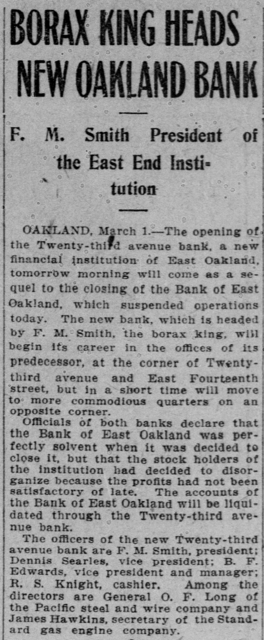BORAX KING HEADS NEW OAKLAND BANK F. M. Smith President of the East End Institution OAKLAND, March 1.-The opening of the Twenty-third avenue bank, a new financial institution of East Oakland, tomorrow morning will come as a sequel to the closing of the Bank of East Oakland, which suspended operations today. The new bank, which is headed by F. M. Smith, the borax king, will begin its career in the offices of its predecessor, at the corner of Twentythird avenue and East Fourteenth street, but in a short time will move to more commodious quarters on an opposite corner. Officials of both banks declare that the Bank of East Oakland was perfectly solvent when it was decided to close it, but that the stock holders of the institution had decided to disorganize because the profits had not been satisfactory of late. The accounts of the Bank of East Oakland will be liquidated through the Twenty-third avenue bank. The officers of the new Twenty-third avenue bank are F. M. Smith, president; Dennis Searles, vice president; B. F. Edwards, vice president and manager; R. S. Knight, cashier. Among the directors are General O. F. Long of the Pacific steel and wire company and James Hawkins, secretary of the Standard gas engine company.