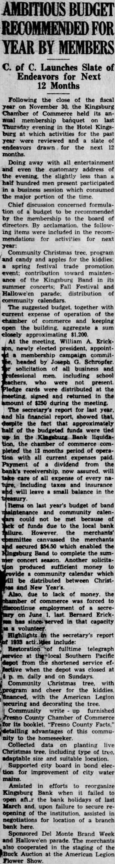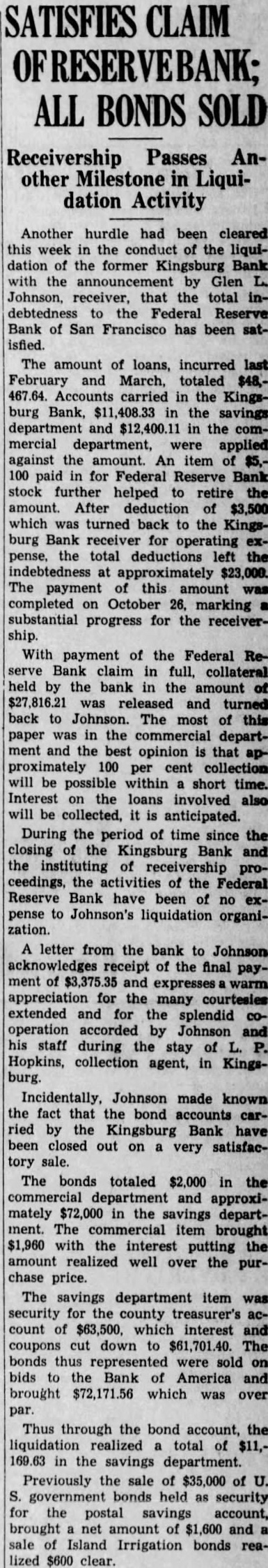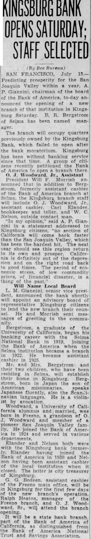 KINGSBURG BANK OPENS SATURDAY; STAFF SELECTED (By Bee Bureau) SAN FRANCISCO, July Predicting prosperity for the San Joaquin Valley within a year. A. P. Giannini. chairman of the board of the Bank of America, to-day announced the opening of new branch of that institution in Kingsburg Saturday B. R. Bergstrom of Selma has been named manager. The branch will occupy quarters previously owned by the Kingsburg Bank, which failed to open after the bank moratorium. Kingsburg has been without banking service that time. group of citizens recently petitioned the Bank of America to open branch there. Woodward. Jr., Assistant nounced that in addition to Bergstrom. formerly assistant cashier of the Bank of America branch Selma, the Kingsburg branch staff will include O. J. Woodward, Jr. assistant Carl and teller. and W. Nelson, contact man. "In my opinion,' said A. Giannini in a statement addressed Kingsburg citizens, "no section of California come back faster than the San Joaquin Valley, which has been the hardest hit. The next should see return to its own and prosper. California is definitely out of the depression on the right road back to good times. The period of eco. nomic of prices, of financial disaster, is thing the Will Name Local Board L. M. Giannini, senior vice presiannounced the bank shortly will appoint an advisory board Kingsburg citizens lend new branch their counsel. He Morrish messages of greeting to the commuBergstrom, a graduate of the University began his banking career with Selma National Bank in 1919. joining the Bank America when the Selma institution became branch 1922. He became assistant cashier in 1925. Mr. and Bergstrom and been residing in Selma, will establish their home in Kingsburg. Bergstrom. born in Japan the son of American speaks Japanese fluently, also the Scandinavian languages. He is a violinist by Woodward, University of Callfornia alumnus and married, born in Fresno, grandson of Woodward and member of San Joaquin Valley famly. He joined the Bank America in 1924 and served in various Elander Nelson both were with the Kingsburg bank formerElander having joined the Bank of in 1930 and Nelson assistant cashier the institution when The latter is city treasurer of Kingsburg. G. G. Bodeen, assistant cashier the Fresno main office, will be Kingsburg for the first few days the branch's Ralph Heaton, manager the Fresno branch, and ward. Sr., will attend the branch opening. It be state bank branch. part of the Bank America of California, as distinguished from the Bank of America National Trust and Savings Association.