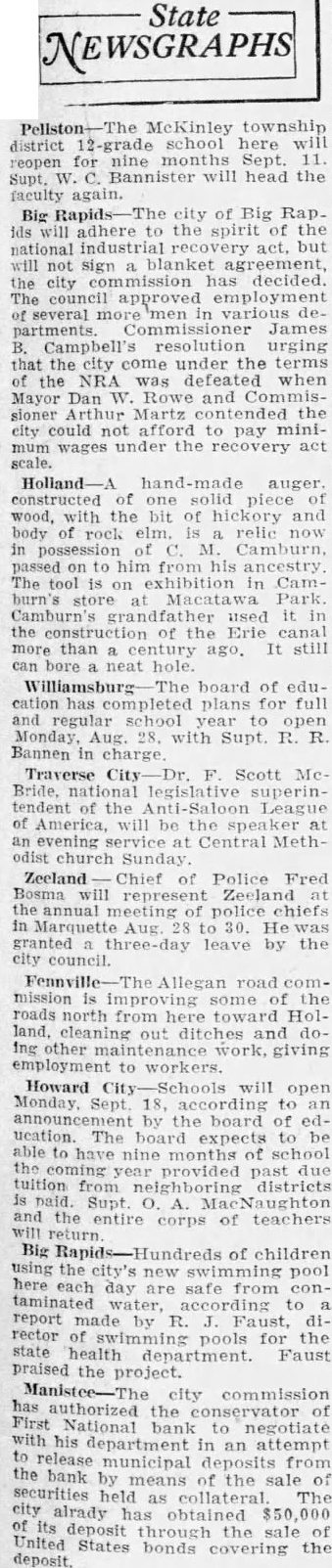 State EWSGRAPHS Pellston-The McKinley township district 12-grade school here will reopen for nine months Sept. 11. Supt. W. Bannister will head the faculty again. Big Rapids- The city of Big Rap. ids will adhere to the spirit of the national industrial recovery act, but will not sign blanket agreement, the city commission has decided. The council approved employment partments. Commissioner James Campbell's resolution urging that the city come under the terms of the NRA was defeated when Mayor Dan W. Rowe and Commissioner Arthur Martz contended the city could not afford to pay minimum wages under the recovery act Holland-A hand-made auger. constructed of one solid piece wood, with the bit of hickory and body of rock elm. is relic now in possession of M. Camburn, passed on to him from his ancestry The tool is on exhibition in Camburn's store at Macatawa Park. Camburn's grandfat used it in the construction of the Erie canal more than century ago. It still can bore neat hole. Williamsburg- The board of education has completed plans for full and regular school year to open Monday Aug. 28. with Supt. R. R. Bannen in charge Traverse City-Dr. F. Scott McBride, national legislative superintendent of the Anti-Saloon League of America, will be the speaker at an evening service at Central Methodist church Sunday Zeeland Chief of Police Fred Bosma will represent Zeeland at the annual meeting of police chiefs in Marquette Aug. 28 to 30. He granted three-day leave by the city council. Fennville- Allegan road commission is some of the roads north from here toward Holland, cleaning out ditches and doIng other maintenance work. giving employment to workers. Howard City-Schools will open Monday, Sept. 18, according to an announcement by the board of education. The board expects to be able to nine months of school the coming year provided past due tuition from neighboring districts is paid. Supt. O. A. MacNaughton and the entire corps of teachers will return Big of children using new swimming pool here each day are safe from contaminated water, according to report made by R. Faust, director of swimming pools for the state health department. Faust praised the project. Manistee-The city commission has authorized the conservator of First National bank to negotiate with his department in an attempt to release municipal deposits from the bank by means of the sale of securities held as collateral The city alrady has obtained 000 of its deposit through the sale of United States bonds covering the