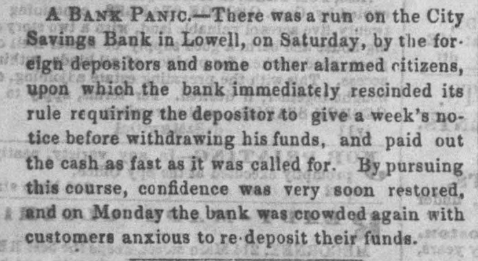 A BANK PANIC-There was a run on the City Savings Bank in Lowell, on Saturday, by the foreign depositors and some other alarmed citizens, upon which the bank immediately rescinded its rule requiring the depositor to give a week's notice before withdrawing his funds, and paid out the cash as fast as it was called for. By pursuing this course, confidence was very soon restored, and on Monday the bank was crowded again with customers anxious to re deposit their funds.