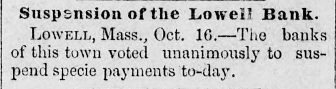 # Suspension of the Lowell Bank. LOWELL, Mass., Oct. 16. -The banks of this town voted unanimously to suspend specie payments to-day.