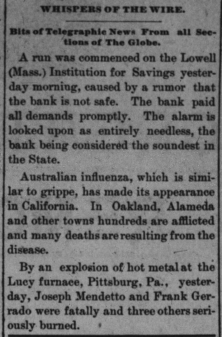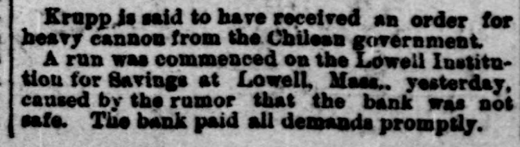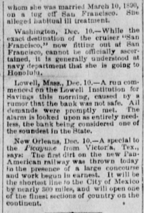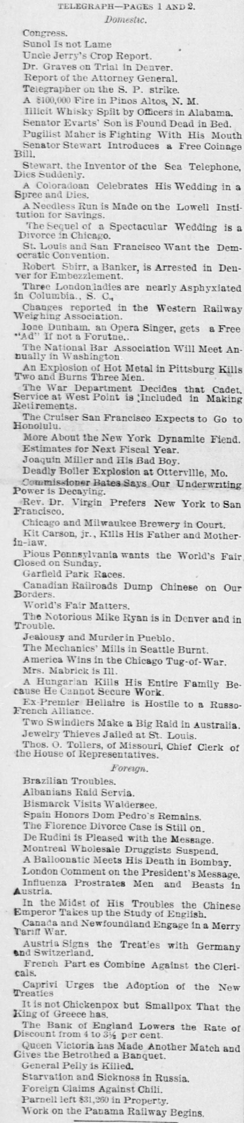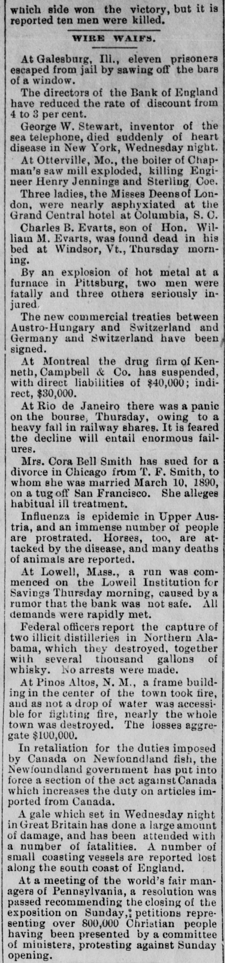 which side won the victory, but it is reported ten men were killed. WIRE WAIFS. At Galesburg, Ili., eleven prisoners escaped from jail by sawing off the bars of a window. The directors of the Bank of England have reduced the rate of discount from 4 to 3 per cent. George W. Stewart, inventor of the sea telephone, died suddenly of heart disease in New York, Wednesday night. At Otterville, Mo., the boiler of Chapman's saw mill exploded, killing Engineer Henry Jennings and Sterling Coe. Three ladies, the Misses Deens of London, were nearly asphyxiated at the Grand Central hotel at Columbia, S.C Charles B. Evarts, son of Hon. Williain M. Evarts, was found dead in his bed at Windsor, Vt., Thursday morning. By an explosion of hot metal at a furnace in Pittsburg, two men were fatally and three others seriously injured. The new commercial treaties between Austro-Hungary and Switzerland and Germany and Switzerland have been signed. At Montreal the drug firm of Kenneth, Campbell & Co. has suspended, with direct liabilities of $40,000; indirect, $30,000. At Rio de Janeiro there was a panic on the bourse, Thursday, owing to a heavy fall in railway shares. It is feared the decline will entail enormous failures. Mrs. Cora Bell Smith has sued for a divorce in Chicago from T. F. Smith, to whom she was married March 10, 1890, on a tug off San Francisco. She alleges habitual ill treatment. Influenza is epidemic in Upper Austria, and an immense number of people are prostrated. Horses, too, are attacked by the disease, and many deaths of animals are reported. At Lowell, Mass., a run was commenced on the Loweil Institution for Savings Thursday morning, caused by a rumor that the bank was not safe. All demands were rapidly met. Federal officers report the capture of two illicit distilleries in Northern Alabama, which they destroyed, together with several thousand gallons of whisky. No arrests were made. At Pinos Altos, N. M., a frame building in the center of the town took fire, and as not a drop of water was accessible for fighting fire, nearly the whole town was destroyed. The losses aggregate $100,000. In retaliation for the duties imposed by Canada on Newfoundland fish, the Newfoundland government has put into force a section of the act against Canada which increases the duty on articles imported from Canada. A gale which set in Wednesday night in Great Britain has done a large amount of damage, and has been attended with a number of fatalities. A number of small coasting vessels are reported lost along the south coast of England. At a meeting of the world's fair managers of Pennsylvania, a resolution was passed recommending the closing of the exposition on Sunday,: petitions representing over 800,000 Christian people having been presented by a committee of ministers, protesting against Sunday opening.
