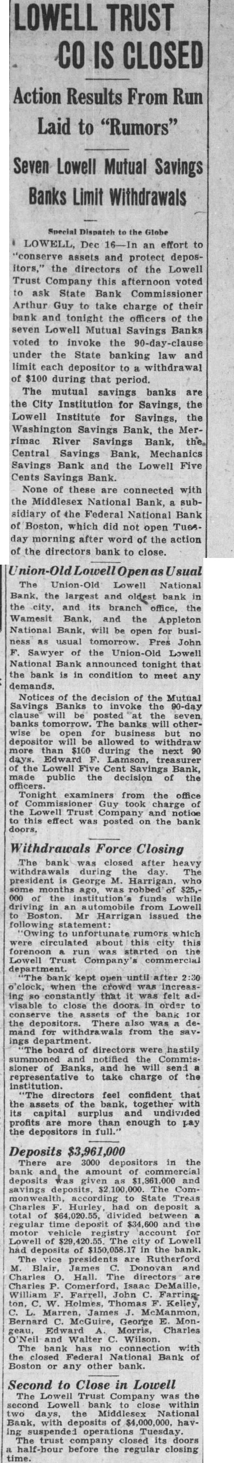 LOWELL TRUST CO IS CLOSED Action Results From Run Laid to "Rumors" Seven Lowell Mutual Savings Banks Limit Withdrawals Special Dispatch to the Globe I LOWELL, Dec 16-In an effort to "conserve assets and protect depositors," the directors of the Lowell Trust Company this afternoon voted to ask State Bank Commissioner Arthur Guy to take charge of their bank and tonight the officers of the seven Lowell Mutual Savings Banks voted to invoke the 90-day-clause under the State banking law and limit each depositor to withdrawal of $100 during that period. The mutual savings banks are the City Institution for Savings, the Lowell Institute for Savings, the Washington Savings Bank, the Merrimac River Savings Bank, the, Central Savings Bank, Mechanics Savings Bank and the Lowell Five Cents Savings Bank. None of these are connected with the Middlesex National Bank, subsidiary of the Federal National Bank of Boston, which did not open Tuesday morning after word of the action of the directors bank to close. The Union-Old Lowell National Bank, the largest and oldest bank in the city, and its branch office, the Wamesit Bank, and the Appleton National Bank, will be open for business as usual tomorrow. Pres John F. Sawyer of the Union-Old Lowell National Bank announced tonight that the bank is in condition to meet any demands. Notices the decision the Mutual Savings Banks to invoke the 90-day clause will be posted "at the seven banks tomorrow. The banks will otherwise be open for business but no depositor will allowed withdraw more than $100 during the next 90 days. Edward F. Lamson, treasurer the Lowell Five Cent Savings Bank, made public the decision of the officers. Tonight examiners from the office of Commissioner Guy took charge of the Lowell Trust Company and notice to effect was posted on the bank Withdrawals Force Closing The bank was closed after heavy withdrawals during the day. The president is George M. Harrigan, who some months ago, was robbed $25,000 of the institution's funds while driving in an automobile from Lowell to Boston. Mr Harrigan issued the following "Owing to unfortunate rumors which were circulated about this city this forenoon was started on the Lowell Trust Company's department. "The bank kept open until after 2:30 o'clock, when the crowd was increasing so constantly that it was felt advisable to close the doors in order to conserve the assets of the bank for the depositors. There also was demand for withdrawals from the savings The board of directors were hastily summoned and notified the Commissioner of Banks, and will send representative to take charge of the "The directors feel confident that the assets of the together with capital surplus and undivided profits more than enough to pay the depositors in full." Deposits $3,961,000 There are 3000 depositors in the bank and, the of deposits was given as and savings deposits, $2 100 The Commonwealth, according to State Treas Charles Hurley had on deposit total of $64,020.55, divided between regular time of and the motor vehicle registry account for Lowell of The city of Lowell had deposits of $150,058.1 in the bank. The vice presidents are Rutherford M Blair, James Donovan and Charles O. Hall. The directors are Charles P. Comerford, Isaac DeMaille, William F. Farrell, John C. Farrington. W. Holmes, Thomas F. Kelley L. Marren, James J. McManmon, Bernard George E. Mongeau, Morris, Charles O'Neil and Walter C. Wilson. The bank has no connection with the closed Federal National Bank of Boston or any other bank. Second to Close in Lowell The Lowell was the second Lowell bank to close within two days, the Middlesex National Bank, with deposits of $4,000,000. havIng suspended operations Tuesday. The trust company closed its doors half-hour before the regular closing time.