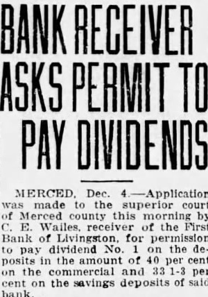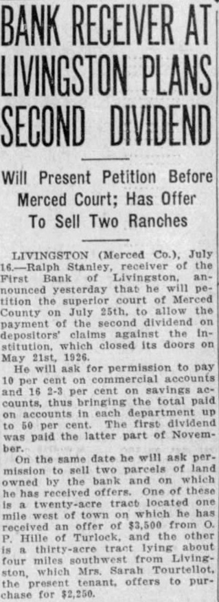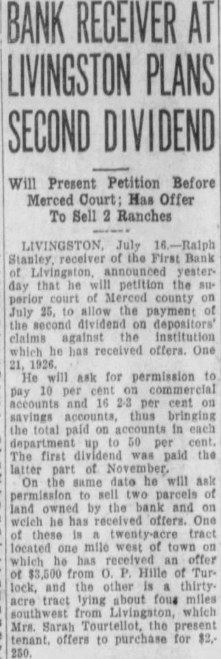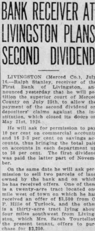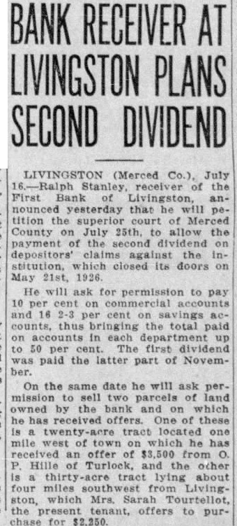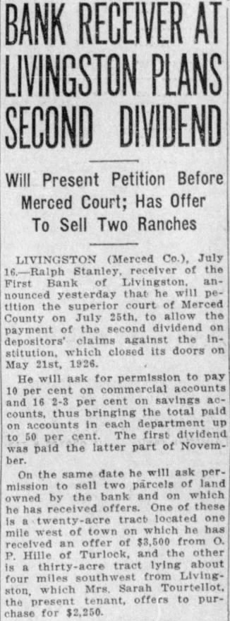 BANK RECEIVER AT LIVINGSTON PLANS SECOND DIVIDEND LIVINGSTON (Merced July the First Bank Livingston, anyesterday that he will tition the of Merced County on July allow the payment the second dividend depositors' claims the Inclosed its doors May 21st, 1926. He will ask for permission to pay 2-3 cent the total department up 50 per The first dividend paid the latter part of November. On the same date he will ask permission sell two parcels owned by the bank on which he offers. these one mile of received an offer Hille Turlock, the other lying about four miles southwest Livingwhich Mrs. Tourtellot, the offers to purchase for $2,250.