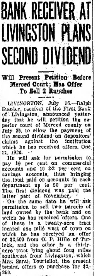 BANK RECEIVER LIVINGSTON PLANS SECOND DIVIDEND Will Present Petition Before Merced Court: Has Offer To Sell Ranches LIVINGSTON, July Stanley the First Bank Livingston, announced yesterthat he petition the Merced county July allow the payment the second dividend on depositors' claims against the institution he has received offers One 1926. He will ask for permission pay 10 per commercial accounts and 2-3 per cent savings thus bringing total paid on in department to 50 per up first was paid the latter part of On the same date he will permission sell two parcels of land owned by the bank and weich he has offers. One these twenty-acre tract located mile west of town which he has an offer $3,500 from Hille of Turlock, and the other thirty. acre tract lying about miles southwest from Livingston, which Mrs. Sarah Tourtellot, the present tenant. offers to purchase for $2,250.