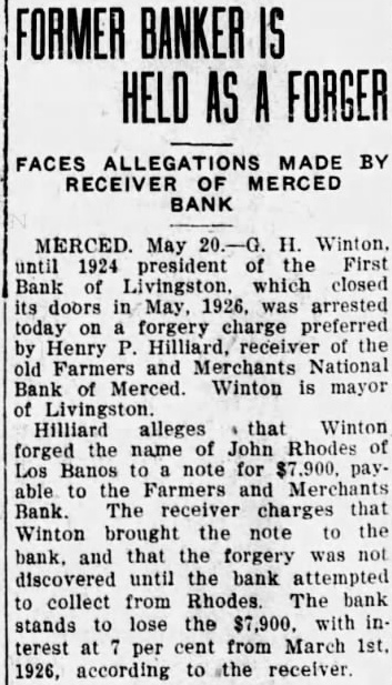 FORMER BANKER IS HELD AS A FORGER FACES ALLEGATIONS MADE BY RECEIVER OF MERCED BANK MERCED. May 20.-G. H. Winton. until 1924 president of the First Bank of Livingston. which closed its doors in May, 1926, was arrested today on forgery charge preferred by Henry P. Hilliard, receiver of the old Farmers and Merchants National Bank of Merced. Winton is mayor of Livingston. Hilliard alleges that Winton forged the name of John Rhodes of Los Banos to a note for $7,900. payable to the Farmers and Merchants Bank. The receiver charges that Winton brought the note to the bank, and that the forgery was not discovered until the bank attempted to collect from Rhodes. The bank stands to lose the $7,900. with interest at per cent from March 1st. 1926, according to the receiver.