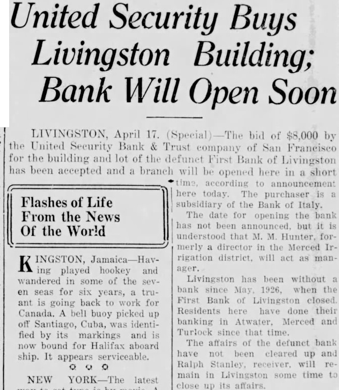 United Security Buys Livingston Building; Bank Will Open Soon LIVINGSTON, April 17. (Special bid of $8,000 by the United Security Bank & Trust company of San Francisco for the building and lot of the defunct First Bank of Livingston has been accepted and a branch will be opened here in a short time, according to announcement here today. The purchaser is Flashes of Life subsidiary of the Bank of Italy. From the News The date for opening the bank has not been announced, but it Of the World understood that M. M. Hunter, formerly director in the Merced Irrigation district, will act as manK INGSTON, ager. ing played hookey and Livingston has been without wandered in some of the sevbank since May. 1926, when the en seas for six years, truFirst Bank of Livingston closed. ant is going back to work for Residents here have done their Canada. A bell buoy picked up banking in Atwater. Merced and off Santiago, Cuba, was identiTurlock since that time. fied by its markings and is The affairs of the defunct bank now bound for Halifax aboard have not been cleared up and ship. It appears serviceable. Ralph Stanley, receiver, will remain in Livingston some time NEW YORK-The latest close up its affairs.