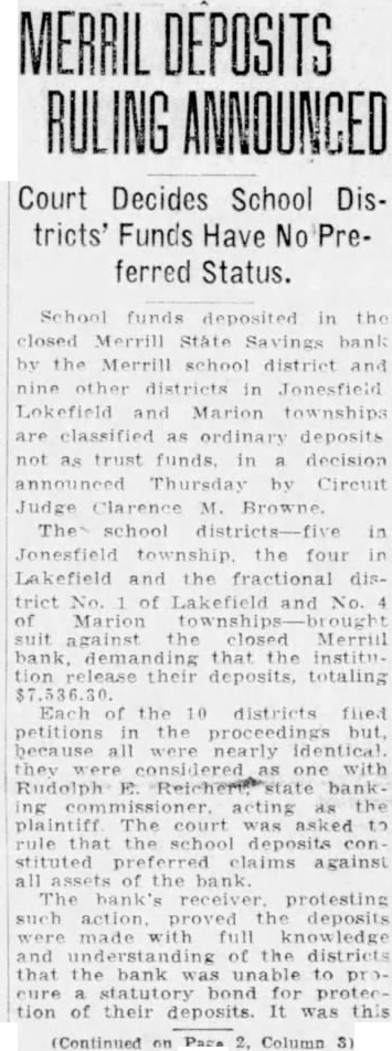 MERRIL DEPOSITS RULING ANNOUNCED Court Decides School Districts' Funds Have No Preferred Status. School closed Merrill State by Merrill school district and districts Jonesfield Lokefield Marion townships classified ordinary deposits as trust in decision Thursday by Circuit in Jonesfield township the four Lakefield and the fractional district of Lakefield and No. of Marion townships suit against closed Merrill that tion their deposits, totaling Each the 10 districts petitions the proceedings but because all nearly identical one with bank ing acting the plaintiff The court was asked school stituted preferred claims against all assets the bank receiver protesting action proved the deposits made full knowledge understanding of the districts that the for tion of their deposits. It was this