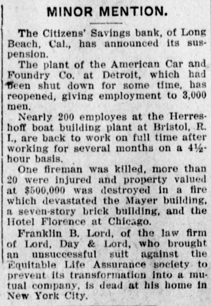 MINOR MENTION. The Citizens' Savings bank, of Long Beach, Cal., has announced its suspension. The plant of the American Car and Foundry Co. at Detroit, which had been shut down for some time, has reopened, giving employment to 3,000 men. Nearly 200 employes at the Herreshoff boat building plant at Bristol, R. I., are back to work on full time after working for several months on a 4½hour basis. One fireman was killed, more than 20 were injured and property valued at $500,000 was destroyed in a fire which devastated the Mayer building, a seven-story brick building, and the Hotel Florence at Chicago. Franklin B. Lord, of the law firm of Lord, Day & Lord, who brought an unsuccessful suit against the Equitable Life Assurance society to prevent its transformation into a mutual company, is dead at his home in New York City.