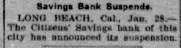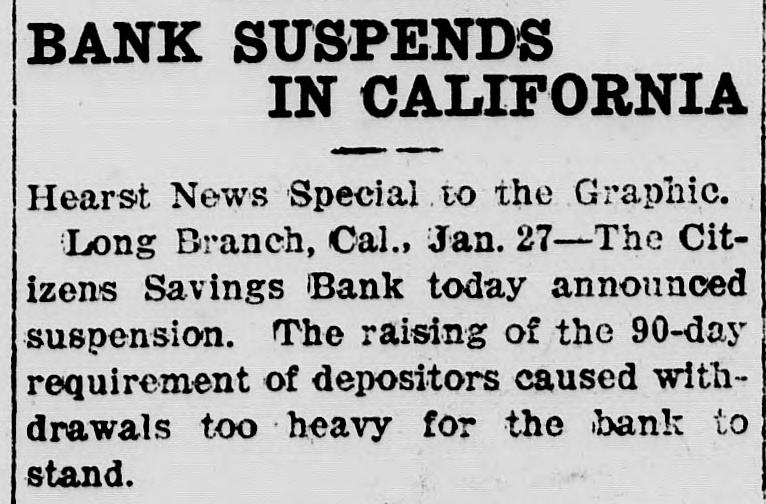 BANK SUSPENDS IN CALIFORNIA Hearst News Special to the Graphic. Long Branch, Cal., Jan. 27-The Citizens Savings Bank today announced suspension. The raising of the 90-day requirement of depositors caused withdrawals too heavy for the bank to stand.
