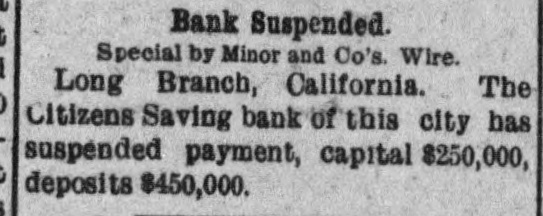 Bank Suspended. Special by Minor and Co's. Wire. Long Branch, California. The Citizens Saving bank of this city has suspended payment, capital $250,000, deposits $450,000.