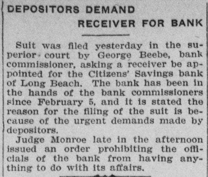 DEPOSITORS DEMAND RECEIVER FOR BANK Suit was filed yesterday in the superior court by George Beebe, bank commissioner, asking a receiver be appointed for the Citizens' Savings bank of Long Beach. The bank has been in the hands of the bank commissioners since February 5, and it is stated the reason for the filing of the suit is because of the urgent demands made by depositors. Judge Monroe late in the afternoon issued an order prohibiting the officials of the bank from having anything to do with its affairs.