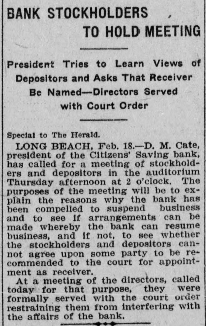 BANK STOCKHOLDERS TO HOLD MEETING President Tries to Learn Views of Depositors and Asks That Receiver Be Named-Directors Served with Court Order Special to The Herald. LONG BEACH, Feb. 18.-D. M. Cate, president of the Citizens' Saving bank, has called for a meeting of stockholders and depositors in the auditorium Thursday afternoon at 2 o'clock. The purposes of the meeting will be to explain the reasons why the bank has been compelled to suspend business and to see if arrangements can be made whereby the bank can resume business, and if not, to see whether the stockholders and depositors cannot agree upon some party to be recommended to the court for appointment as receiver. At a meeting of the directors, called today for that purpose, they were formally served with the court order restraining them from interfering with the affairs of the bank.