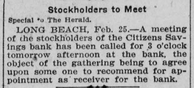 Stockholders to Meet Special *o The Herald. LONG BEACH, Feb. 25.-A meeting of the stockholders of the Citizens Savings bank has been called for 3 o'clock tomorrow afternoon at the bank, the object of the gathering being to agree upon some one to recommend for appointment as receiver for the bank.
