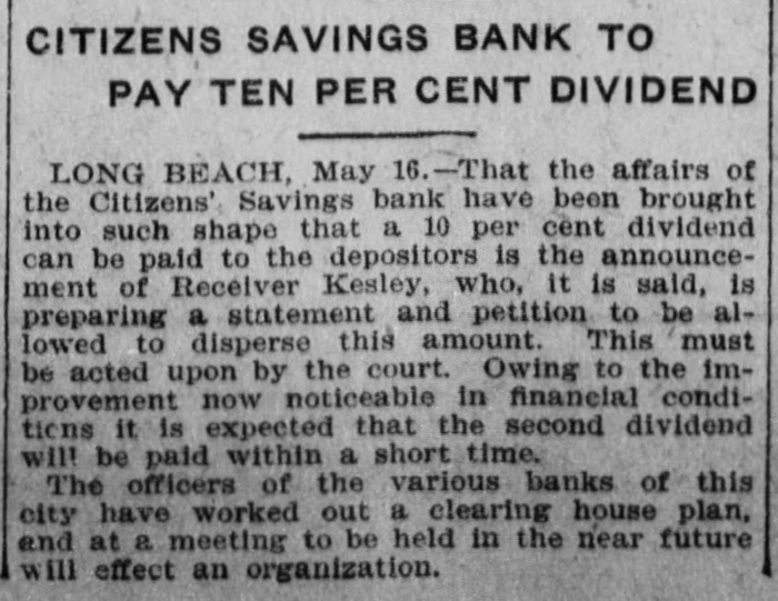 CITIZENS SAVINGS BANK TO PAY TEN PER CENT DIVIDEND LONG BEACH, May 16.-That the affairs of the Citizens' Savings bank have been brought into such shape that a 10 per cent dividend can be paid to the depositors is the announcement of Receiver Kesley, who, it is said, is preparing a statement and petition to be allowed to disperse this amount. This must be acted upon by the court. Owing to the improvement now noticeable in financial conditions it is expected that the second dividend will be paid within a short time. The officers of the various banks of this city have worked out a clearing house plan, and at a meeting to be held in the near future will effect an organization.
