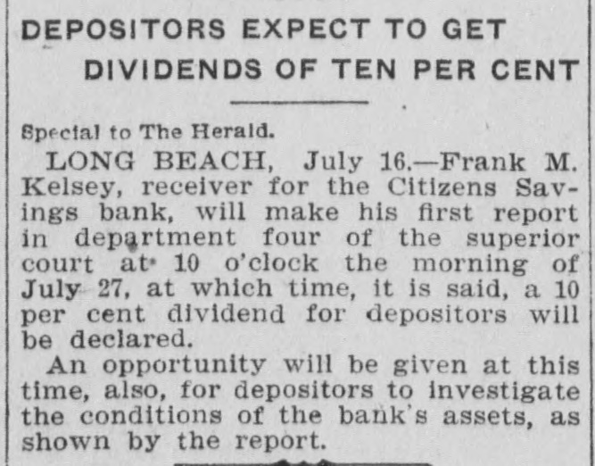 DEPOSITORS EXPECT TO GET DIVIDENDS OF TEN PER CENT Special to The Herald. LONG BEACH, July 16.-Frank M. Kelsey, receiver for the Citizens Savings bank, will make his first report in department four of the superior court at* 10 o'clock the morning of July 27, at which time, it is said, a 10 per cent dividend for depositors will be declared. An opportunity will be given at this time, also, for depositors to investigate the conditions of the bank's assets, as shown by the report.