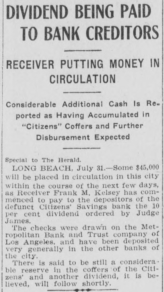 DIVIDEND BEING PAID TO BANK CREDITORS RECEIVER PUTTING MONEY IN CIRCULATION Considerable Additional Cash Is Reported as Having Accumulated in "Citizens" Coffers and Further Disbursement Expected Special to The Herald. LONG BEACH, July 31.-Some $45,000 will be placed in circulation in this city within the course of the next few days, as Receiver Frank M. Kelsey has commenced to pay to the depositors of the defunct Citizens' Savings bank the 10 per cent dividend ordered by Judge James. The checks were drawn on the Metropolitan Bank and Trust company of Los Angeles, and have been deposited very generally in the other banks of the city. There is said to be still a considerable reserve in the coffers of the Citizens' and another dividend, it is believed, will follow shortly.