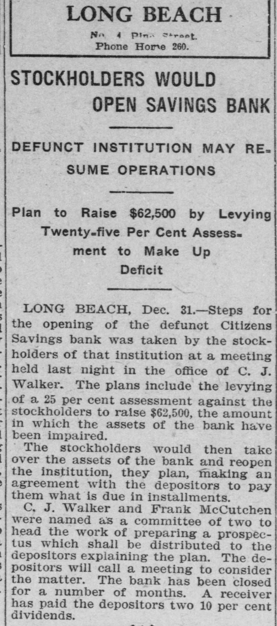 LONG BEACH No 4 Pino street Phone Home 260. STOCKHOLDERS WOULD OPEN SAVINGS BANK DEFUNCT INSTITUTION MAY RESUME OPERATIONS Plan to Raise $62,500 by Levying Twenty-five Per Cent Assess= ment to Make Up Deficit LONG BEACH, Dec. 31.-Steps for the opening of the defunct Citizens Savings bank was taken by the stockholders of that institution at a meeting held last night in the office of C. J. Walker. The plans include the levying of a 25 per cent assessment against the stockholders to raise $62,500, the amount in which the assets of the bank have been impaired. The stockholders would then take over the assets of the bank and reopen the institution, they plan, making an agreement with the depositors to pay them what is due in installments. C, J. Walker and Frank McCutchen were named as a committee of two to head the work of preparing a prospectus which shall be distributed to the depositors explaining the plan. The depositors will call a meeting to consider the matter. The bank has been closed for a number of months. A receiver has paid the depositors two 10 per cent dividends.