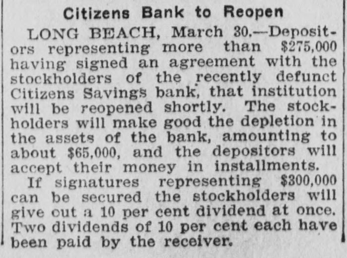 Citizens Bank to Reopen LONG BEACH, March 30.-Depositors representing more than $275,000 having signed an agreement with the stockholders of the recently defunct Citizens Savings bank, that institution will be reopened shortly. The stockholders will make good the depletion in the assets of the bank, amounting to about $65,000, and the depositors will accept their money in installments. If signatures representing $300,000 can be secured the stockholders will give out a 10 per cent dividend at once. Two dividends of 10 per cent each have been paid by the receiver.
